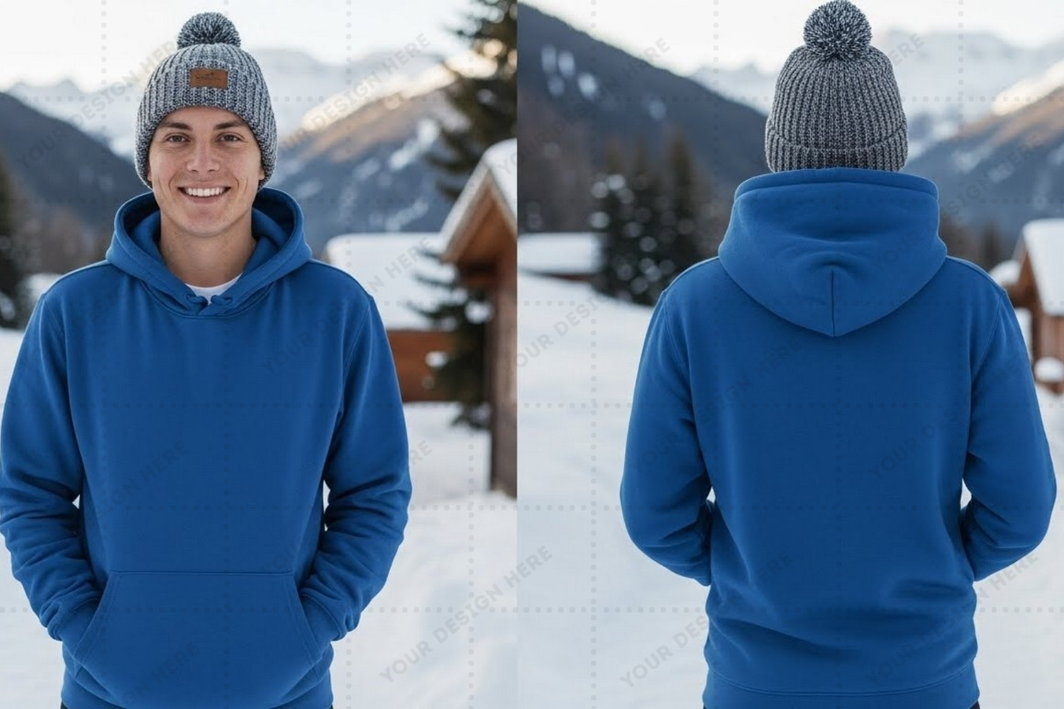 Snow Outdoor Mountains Cabin Hoodie Beanie Snowy Mountains Winter Clothing Blue Hoodie Pom-pom