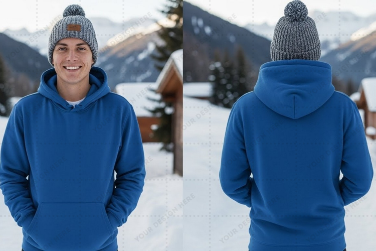 Blue hoodie with snowy mountain t-shirt mockup design example image 1