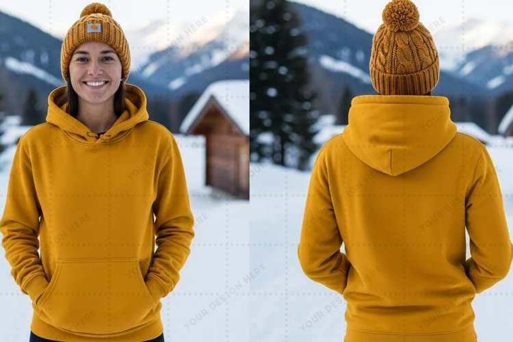 Mustard yellow hoodie with pom pom beanie t-shirt mockup des