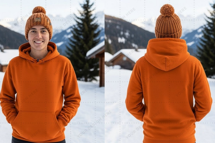 Winter Outdoor Orange Front View Back View Hoodie Unisex Beanie Casual Wear Pom-pom