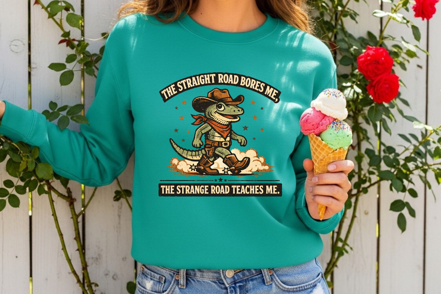 Funny Western Quote Cowboy Humor Design Straight Road Bores Me Strange Road Teaches Me Cowboy Lizard Design Western Lizard Character Funny Cowboy Lizard Wild West Lizard Cartoon Cowboy Reptile Mascot Lizard Cowboy Shirt