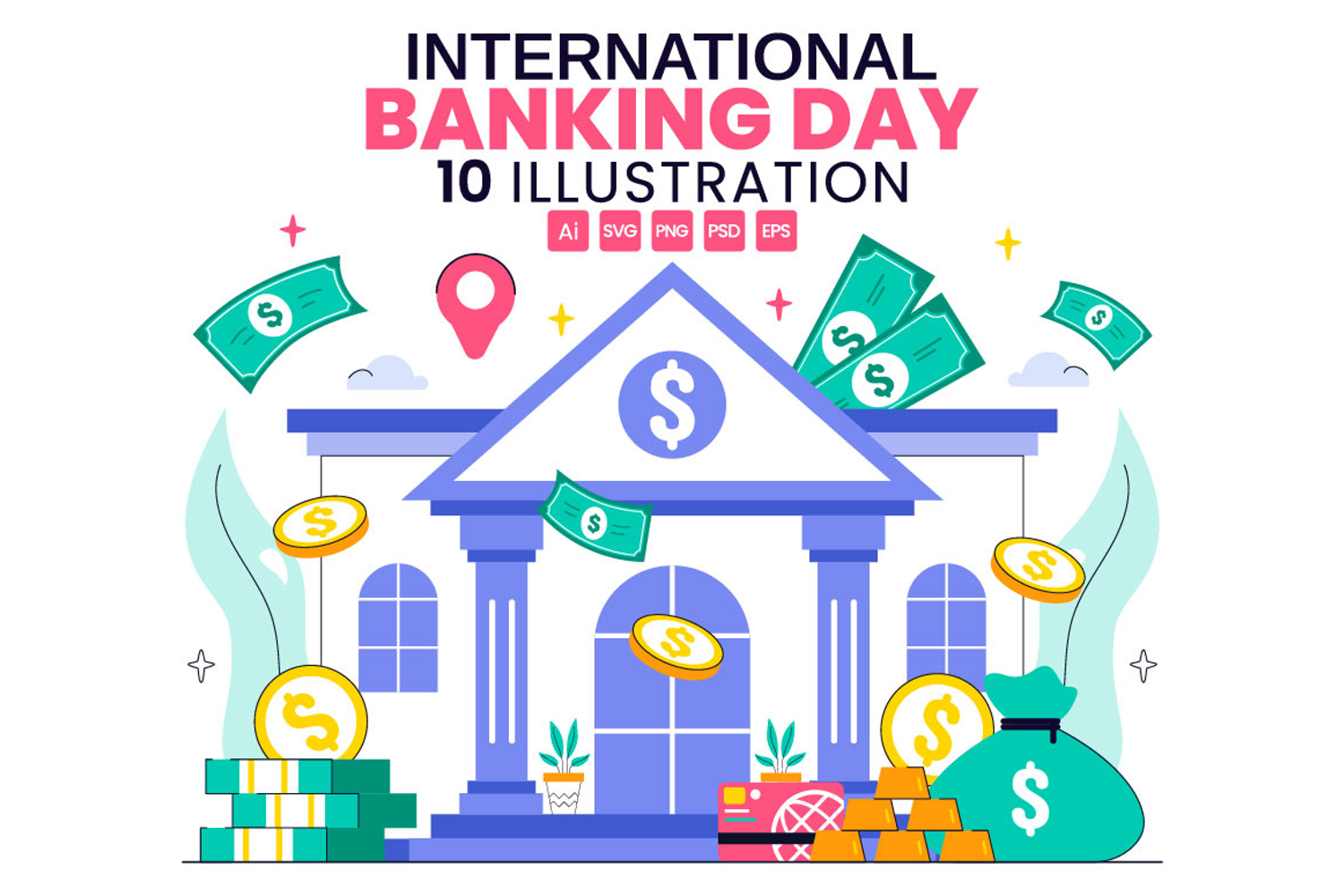 International Banking Day Vector Illustration Featuring Bank, Money, and Coins to Support Sustainable Development and Global Economic Stability Suitable for Poster, Web Banner, Brochure, Landing Page and Others Background Template Features: