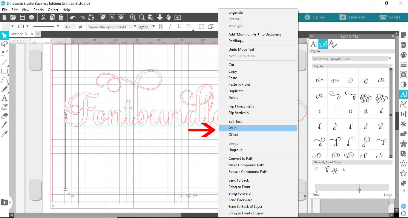 11- Once you are happy with the finished glyphs and text, right-click and group. If you want all the letters to join (if overlapped), you can click weld to join the overlapping letters.