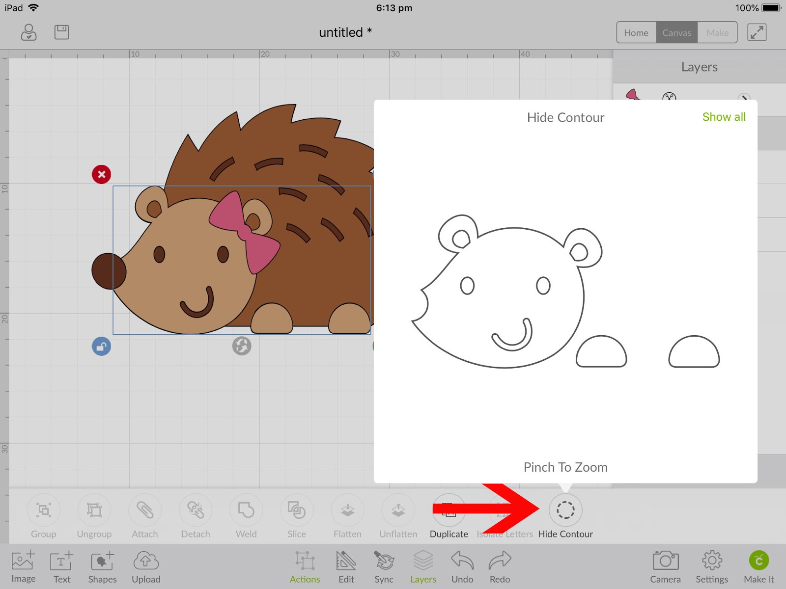8- Next tap on the Actions icon, then the hide contour icon. A new little window will appear.