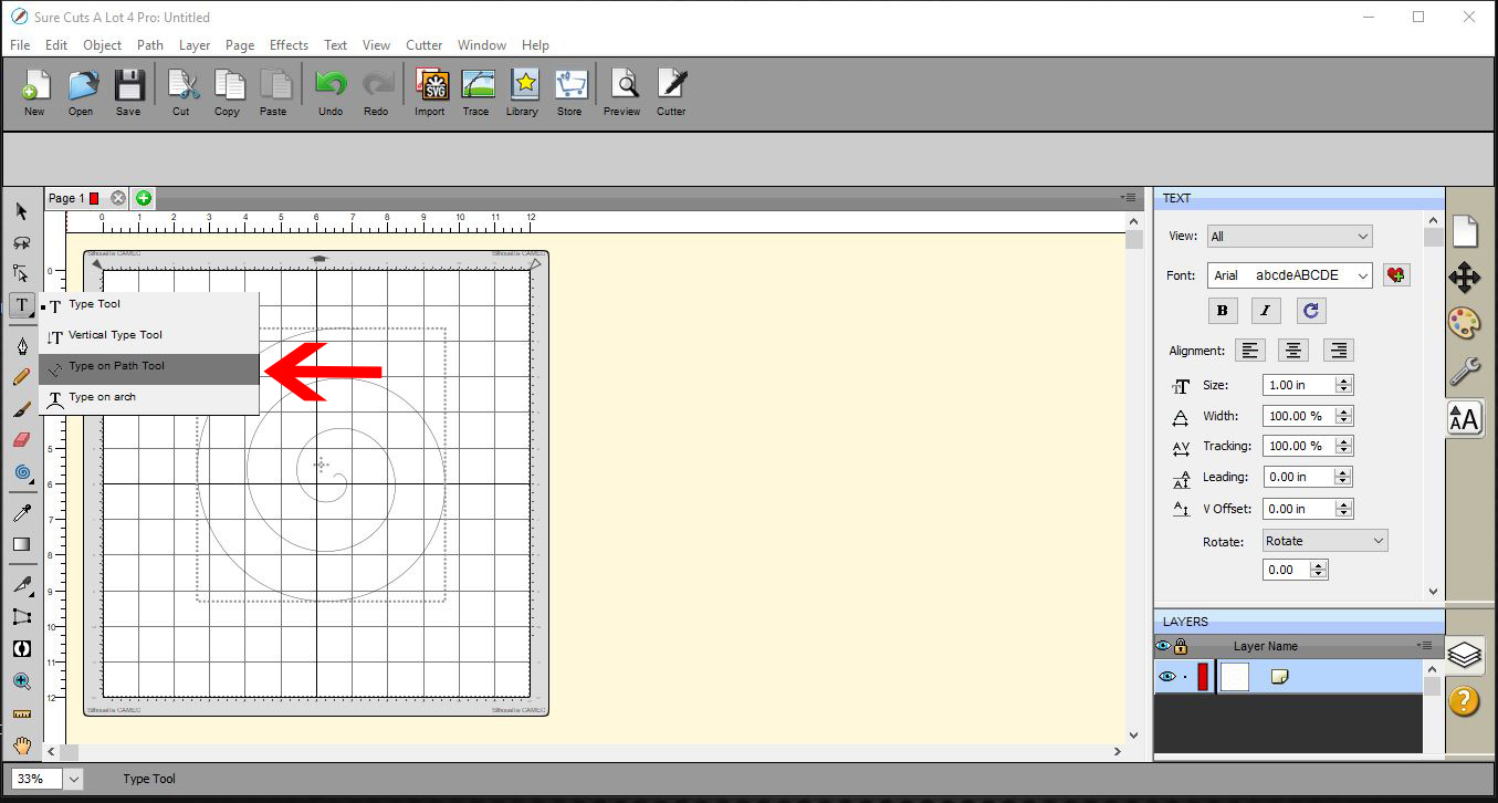 *Note - Sure Cuts a Lot 4 Pro used.1- Open SCAL4 software.2- The text tool on the left toolbar gives you 4 different options.Standard text toolVertical text toolType on path toolType on archThese 4 options can be accessed by clicking on the text tool with your mouse and holding it. ...