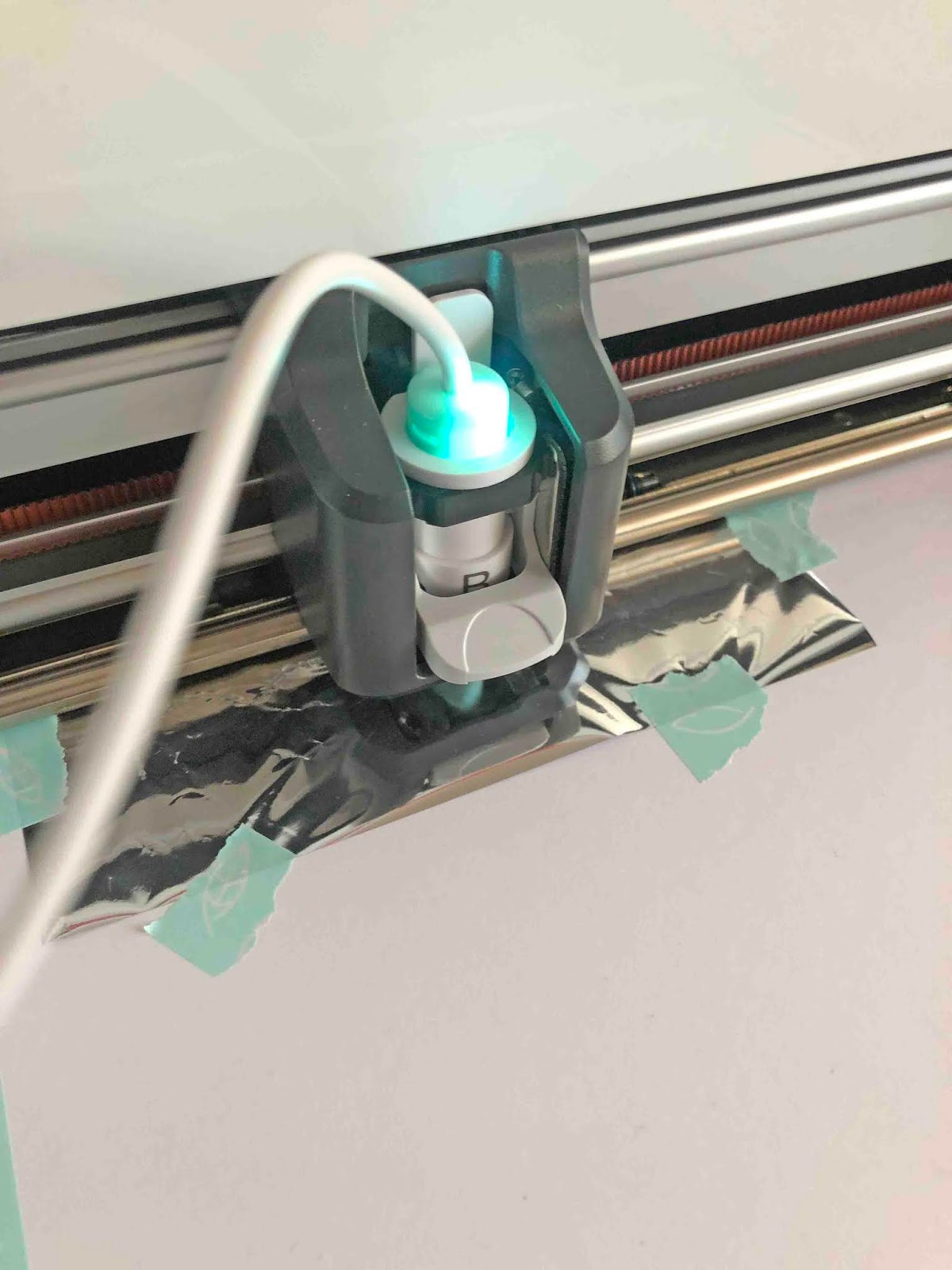 *CM900 used.1-Open the front of your Brother scan and cut machine. Lift the tab at the front of the blade holder.2- Carefully remove the blade and casing.3- Screw on the B adapter to the foil quill. Plug into a USB power bank. The light should come on ...