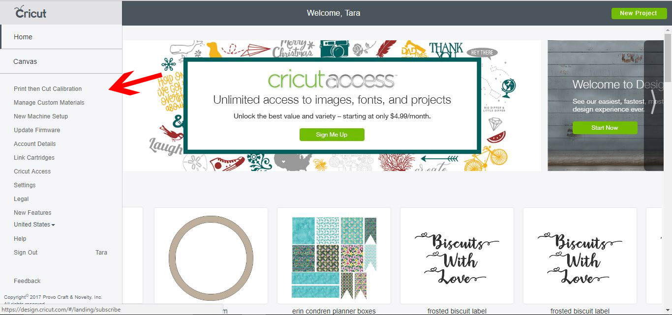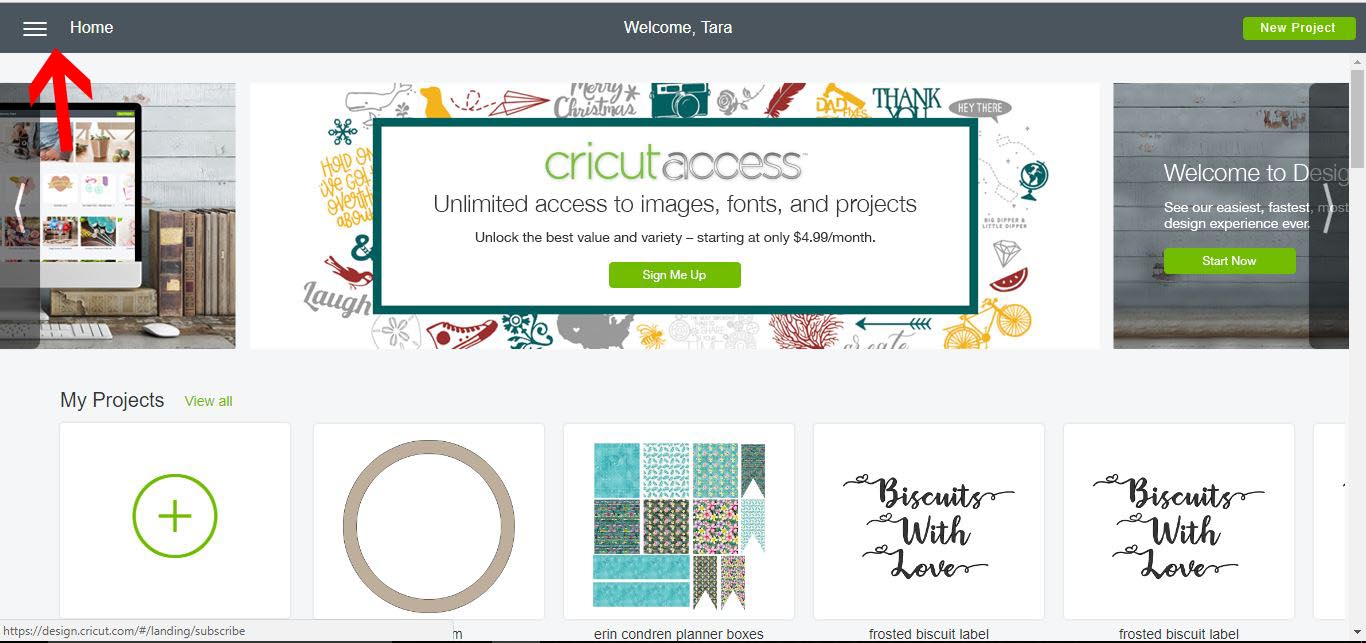 1- Open Cricut Design Space. The new opening pages has a cleaner layout with everything clearly displayed. Everything you need for your cricut machine is now found at the top left home icon.
