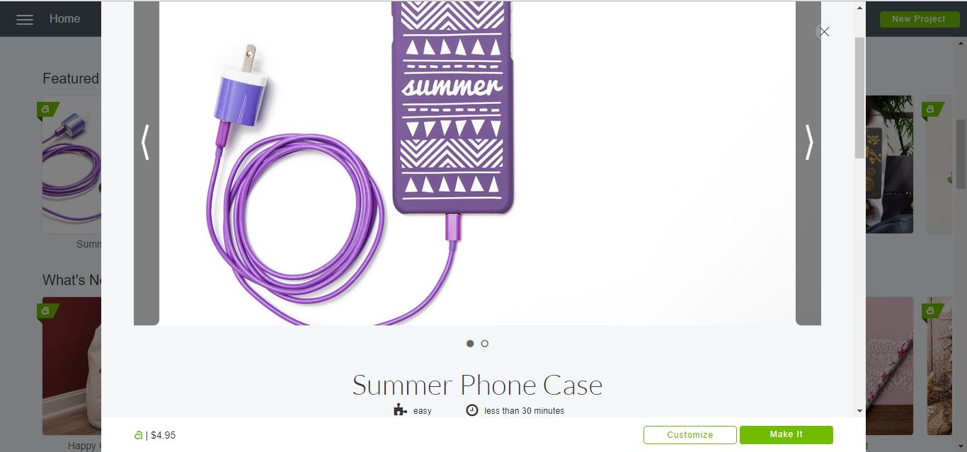6- When you select a project that cricut has created, A new pop up window will appear with the project image and the option to customize it or make it. If you select the make it icon you will make the design in the image, where if you select the customize icon you have the option to change the design.