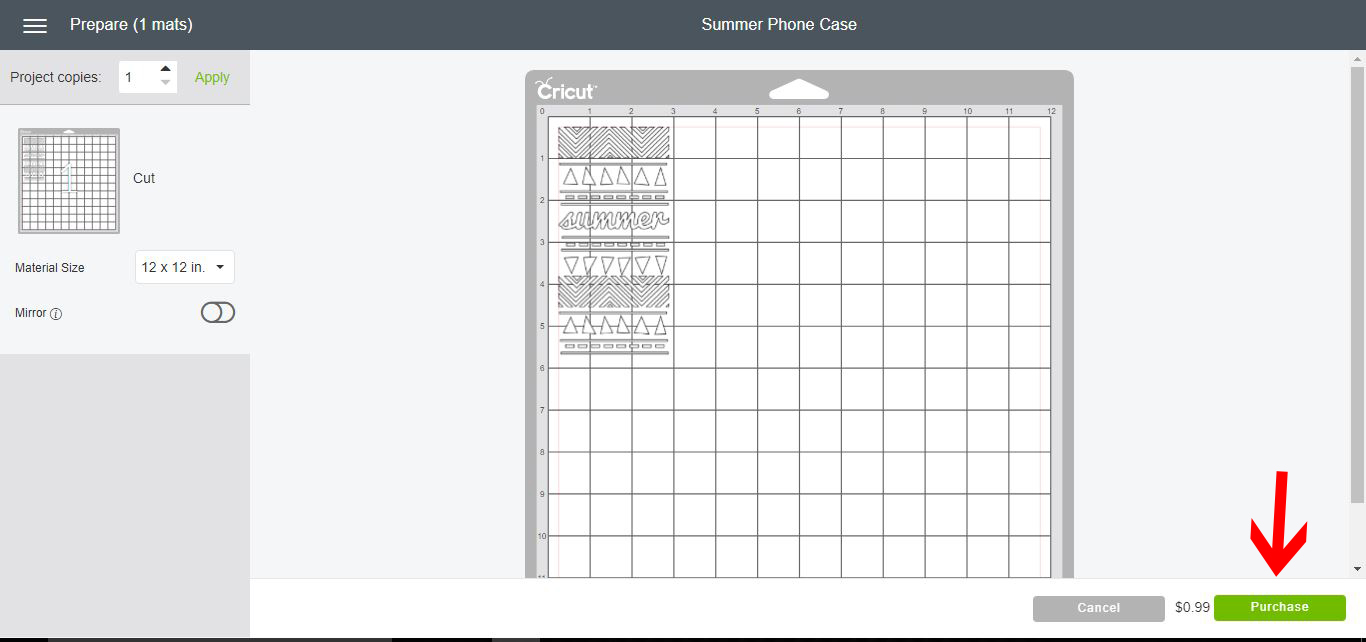 7-After selecting the make it icon, the new software automatically takes you to the cut screen now. If there is a cost for the design you will see a purchase icon and a price. If the item is free or you have cricut access you will have a continue icon.