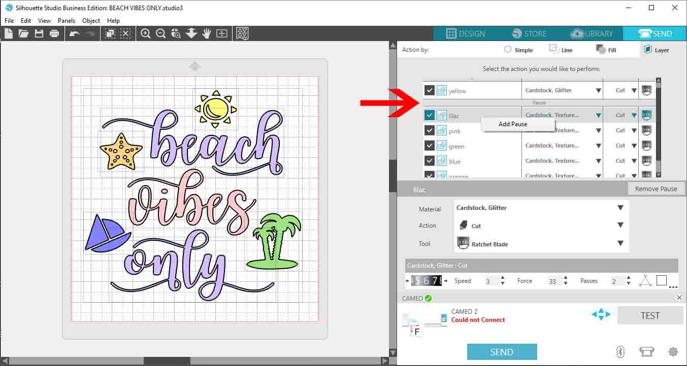 Alternatively, right click on a layer and insert a pause option. This will stop the machine after it cuts each layer, giving you enough time to make changes. Changes can be the type of media, the blade depth and more for each layer.