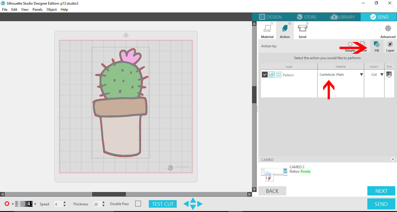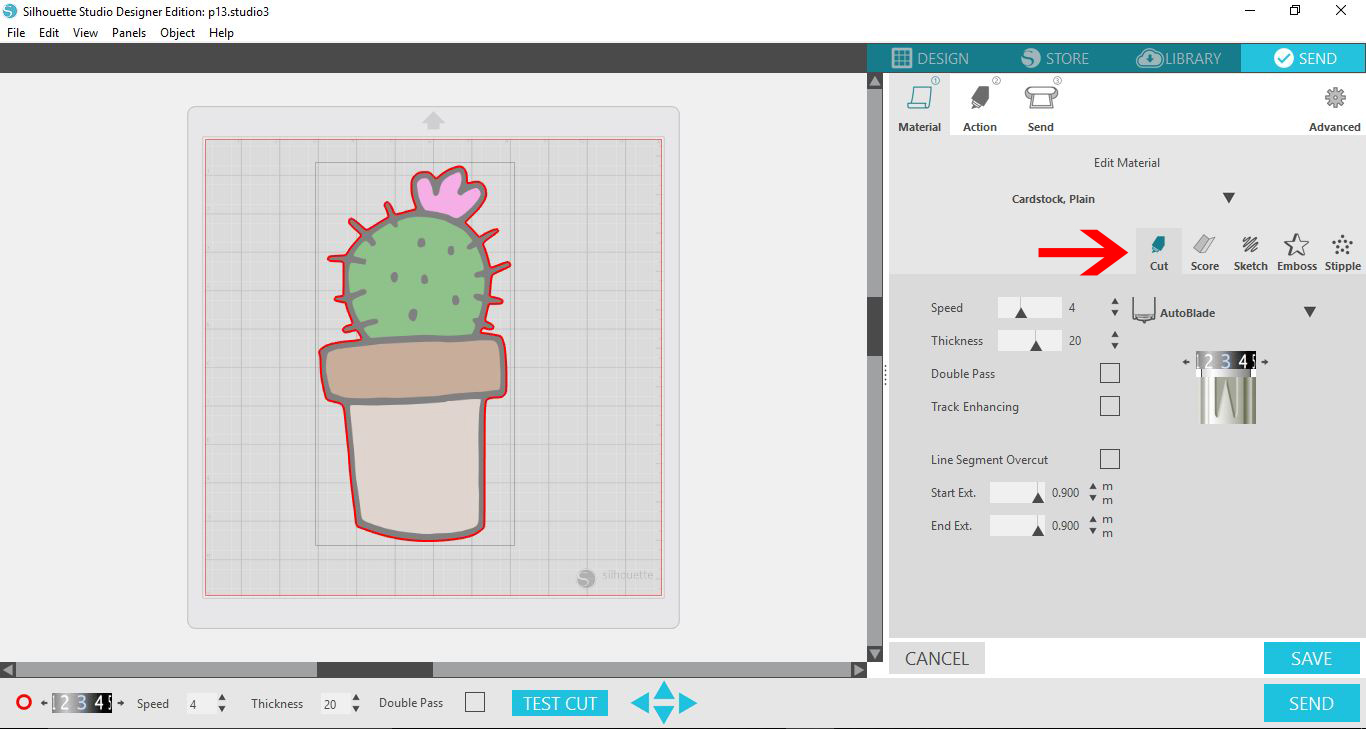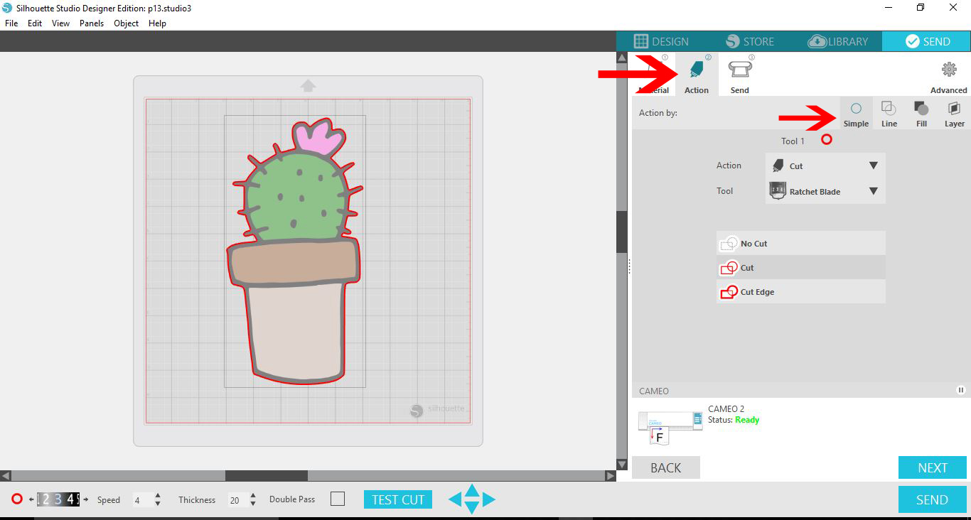 11- Next is the action option. Here you can choose how you cut your design and what you want to cut, and also check ensure the sections you want to cut are highlighted.