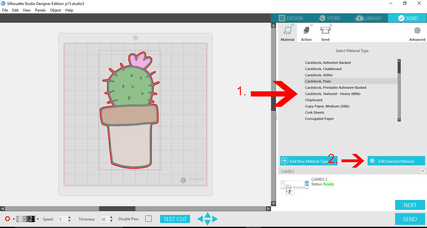 When this is selected you will see a variety of medias to use. If you are using a silhouette branded product, it will be listed in this selected area.(1) There are also some generic cut settings like cardstock and vinyl.If your media is not listed you can select the closest media from the selection, then select edit selected material icon (2).