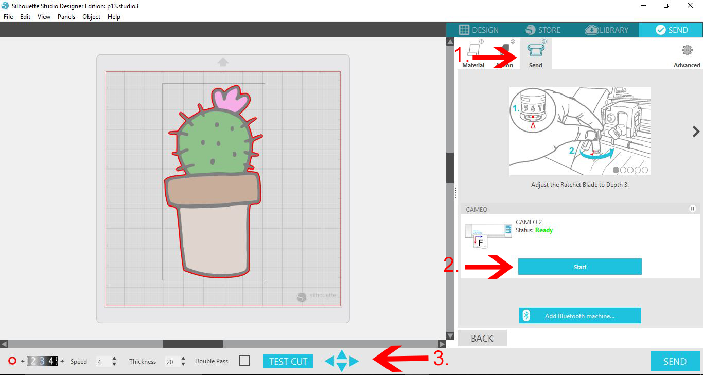 16- In the send window (1) there is a step by step panel on how to change your blade and depth. When you are happy with the settings click Send (2). At this point the machine will start and as a new feature there is a countdown timer which will tell you how long your image will take to cut.