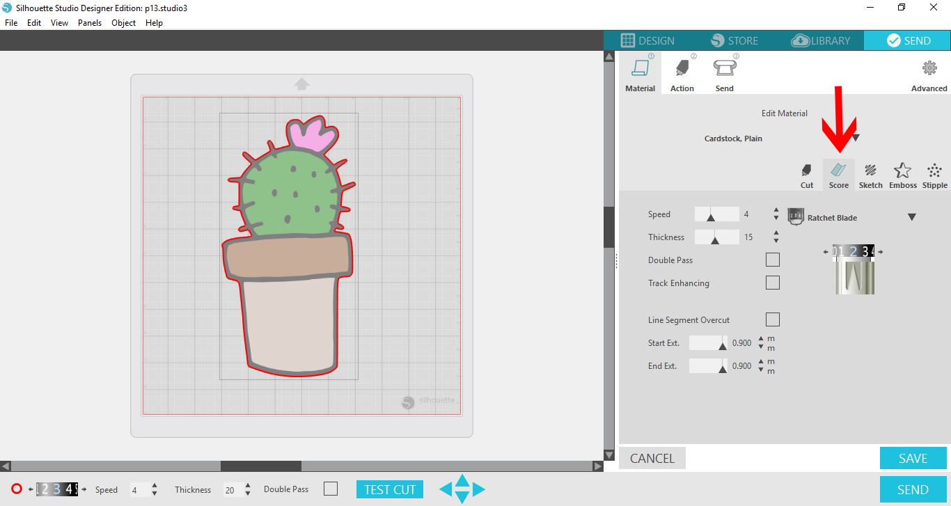 6- The next option you have is a score option. This is a great feature if you are making greeting cards or 3D items and only need to score the folds and not cut them.