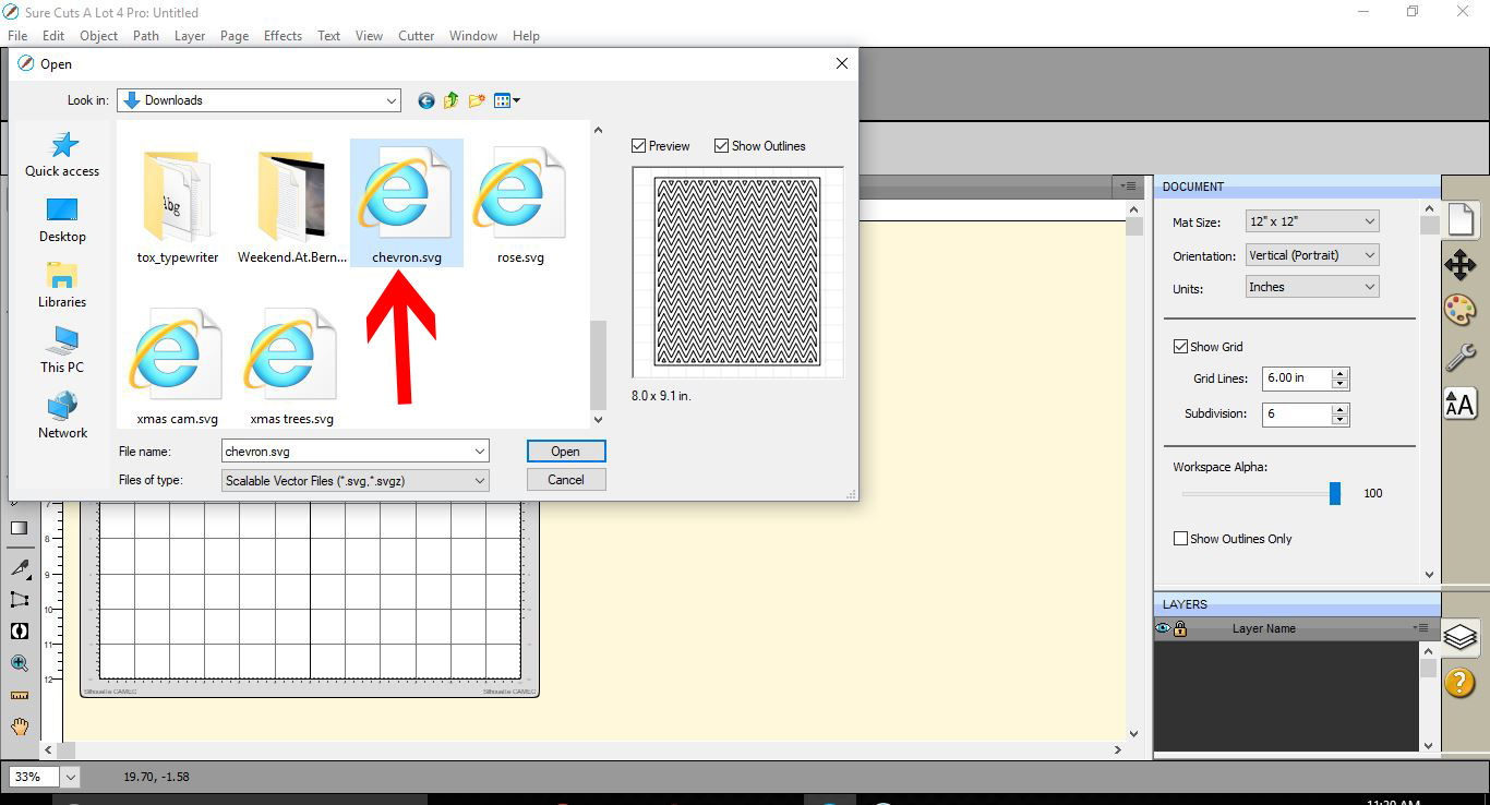 *note- SCAL4 pro used.1- Open SCAL4 software.2- Go to File > Import.3- Go to the location of your SVG file. Once you select it click open.4- Your design will now be in your design area for you to use and cut.