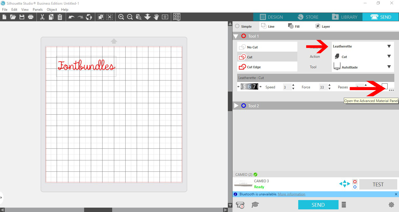 4- Click on the send icon. To foil leather you will need to make a few changes in the cut menu. Most leather is quite thick so we do want it to damage the leather when foiling. Change the material to leatherette. This will not give you an option to sketch or emboss. we need to add this. Click on the 3 dots to go to the advanced menu.