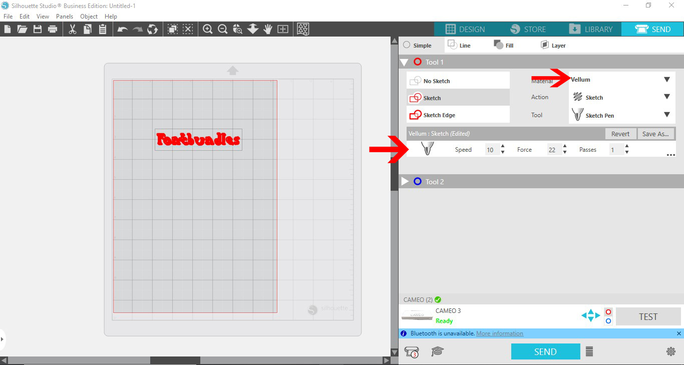 4- Go to the send screen when your design is finished. Choose vellum as the medium. Set the tool to sketch pen, and the speed to 10 ,force to 22 and pass 1. With vellum it can easily rip, so getting the force and speed right makes all the difference.