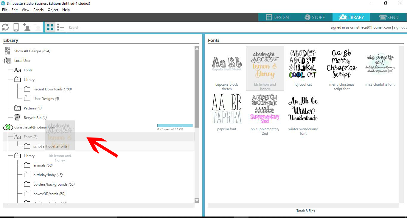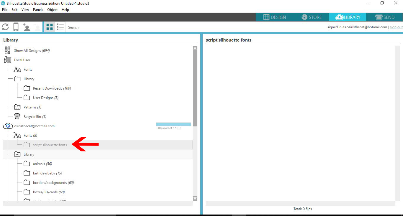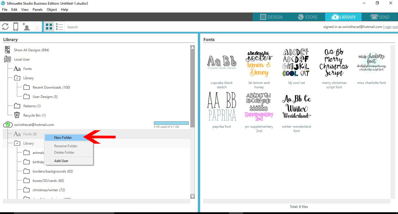 You can also create new folders for your fonts. Keep in mind this only works with fonts purchased from Silhouette Studio. Organizing fonts this way allows you to quickly locate a specific font style. Click on the Library icon top right.