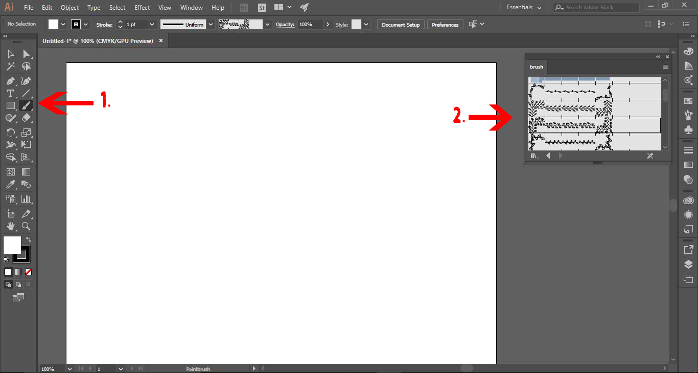 6-Select the paintbrush tool from the left toolbar (1).Next select the brush you would like to use (2).