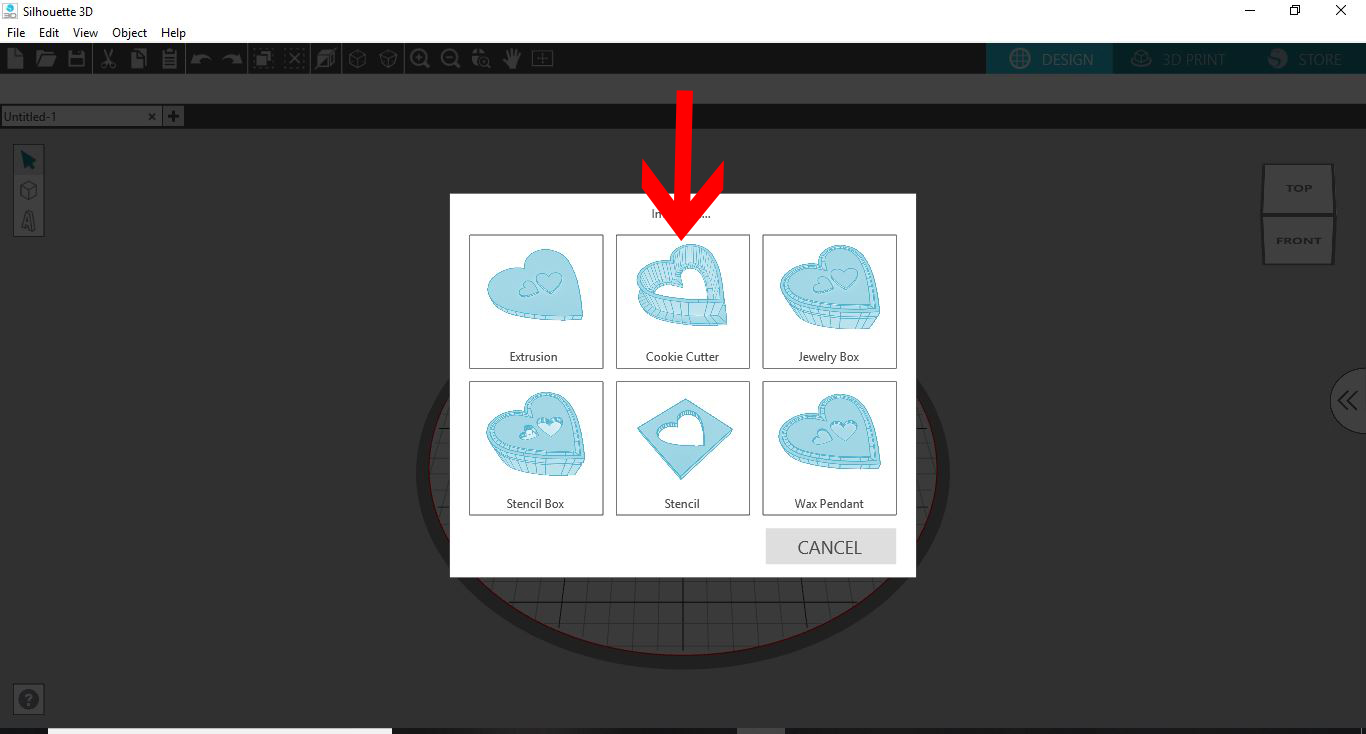 1- Open Silhouette Alta 3D software. Click on the right tab to access the library.2- Click on the library.3- Select a basic 2D file. Double click on it.4- A new window will appear. Select the cookie cutter option.5- Your design will appear directly as a cookie ...