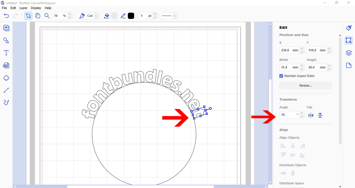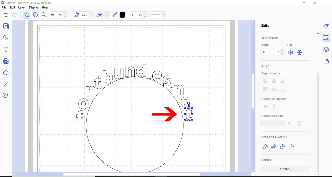 8- Select each letter one by one and adjust the angle so the letter is touching the circle.