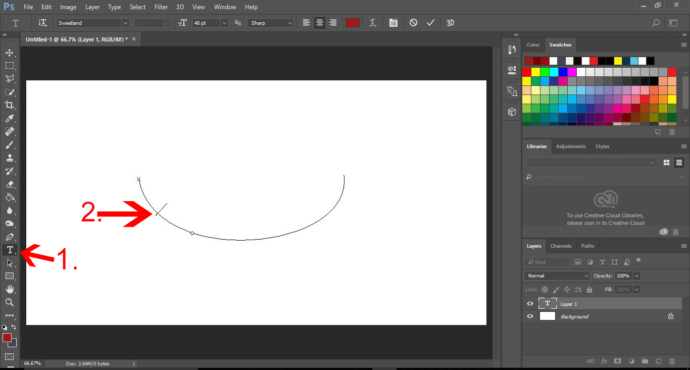 6- Select the text tool (1) Hover it over your curved line, you will see the cursor change to a cursor with a squiggly line. Click on the line.