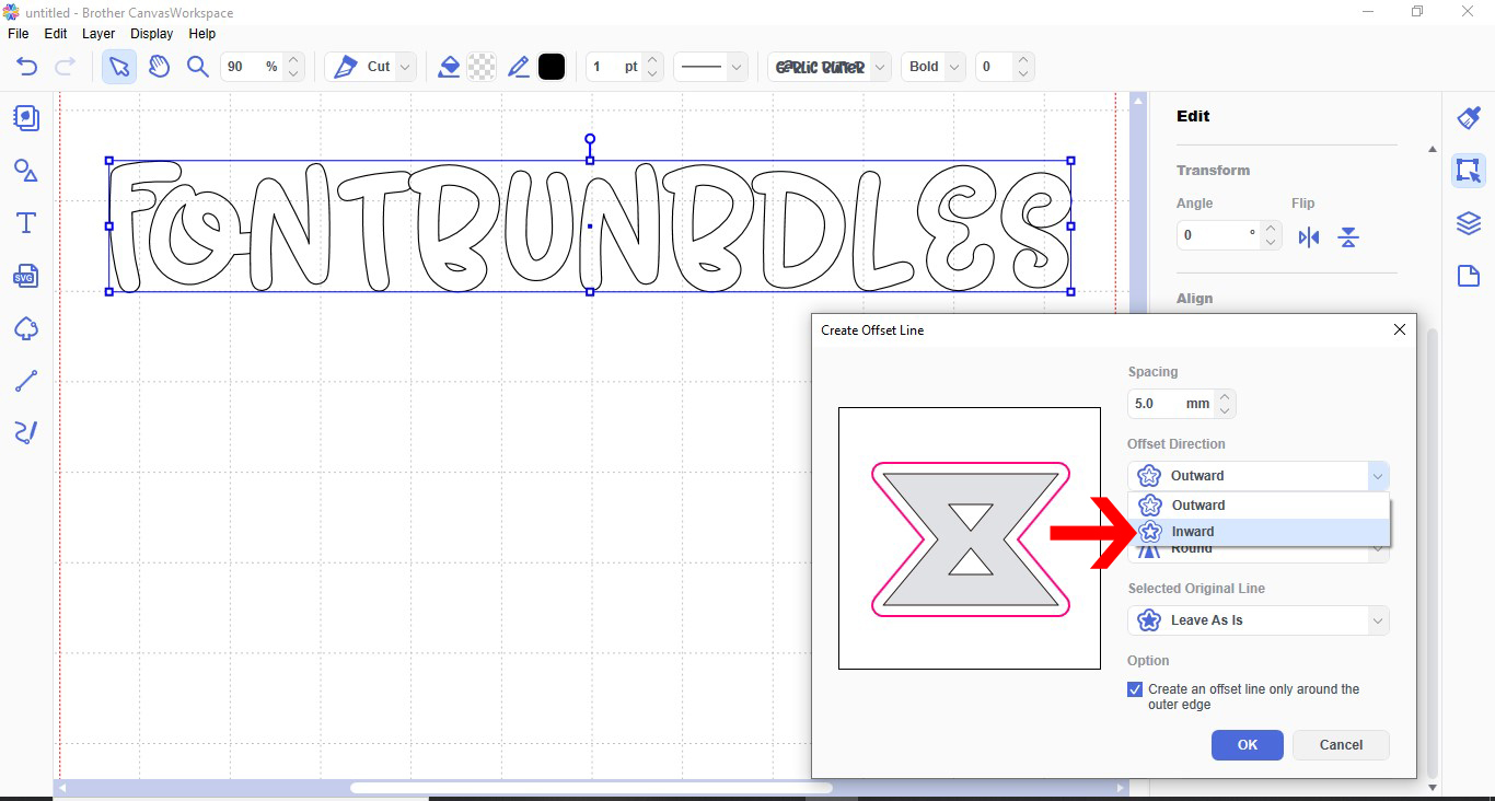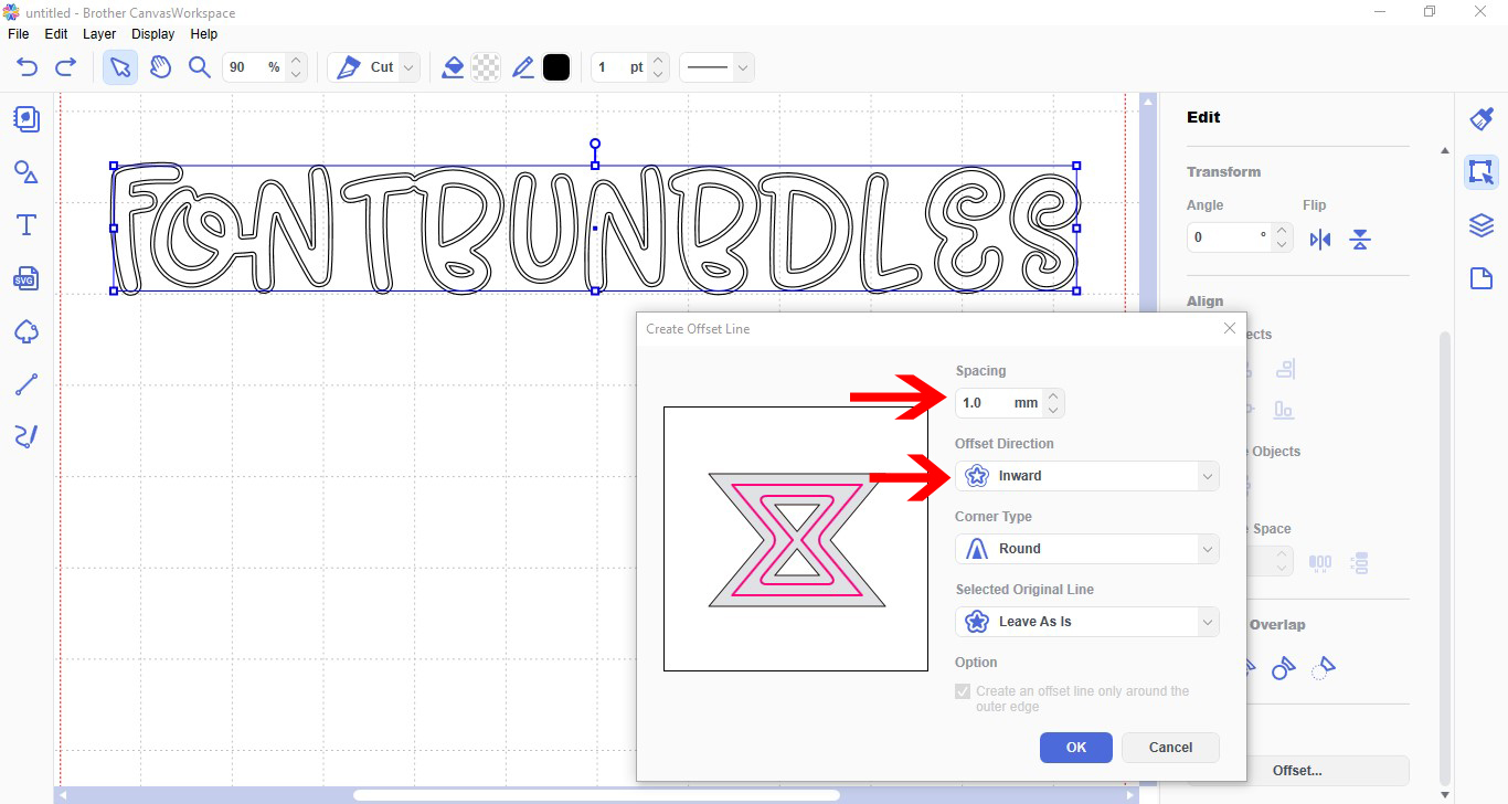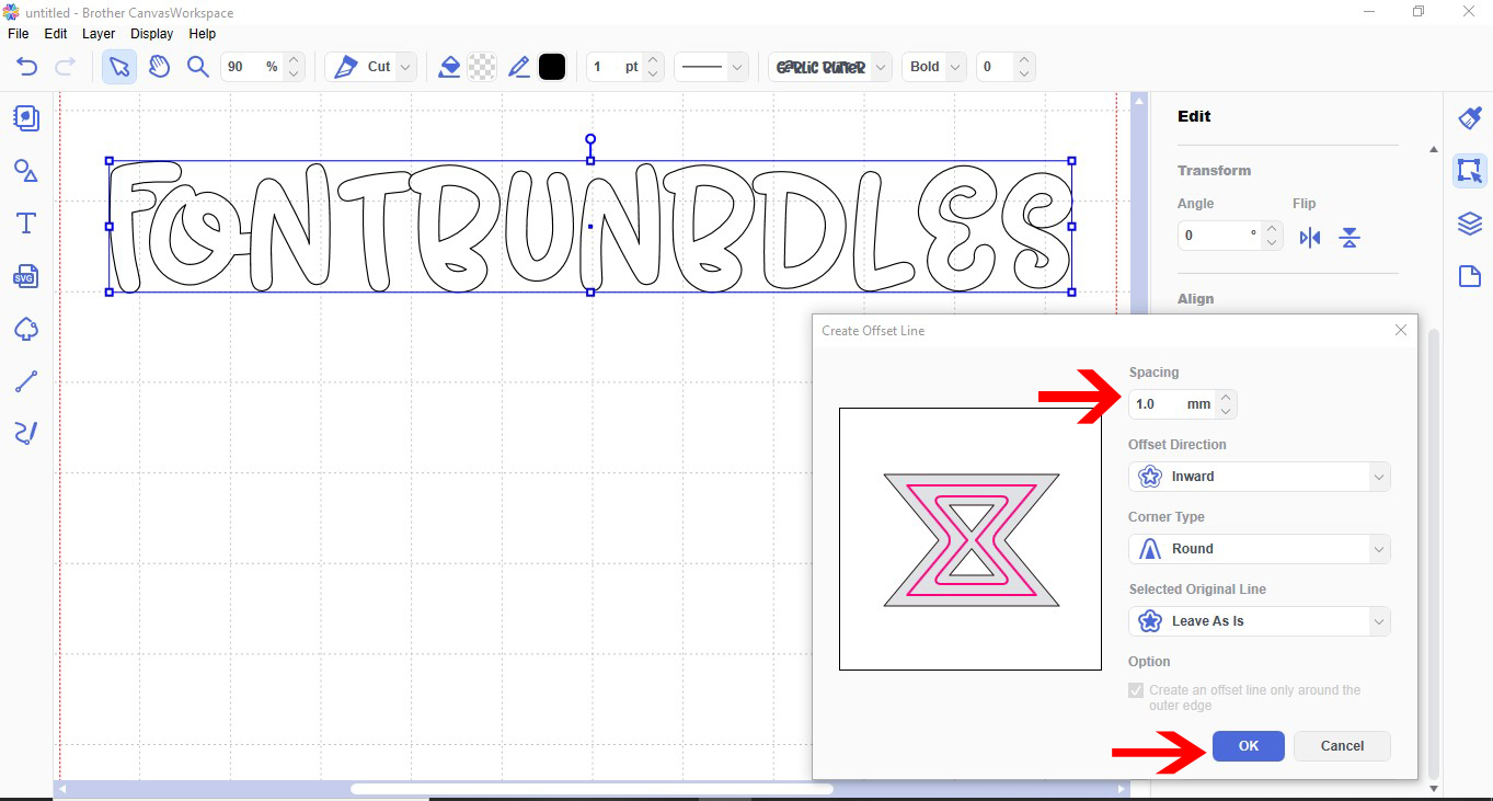 *CM900 model used.1- Open canvas workspace. Click on the text icon.2- With the text selected click on the edit panel.3- Click on the offset icon. new window will pop up. This will enable you to place an internal or external offset in your text. You can adjust ...