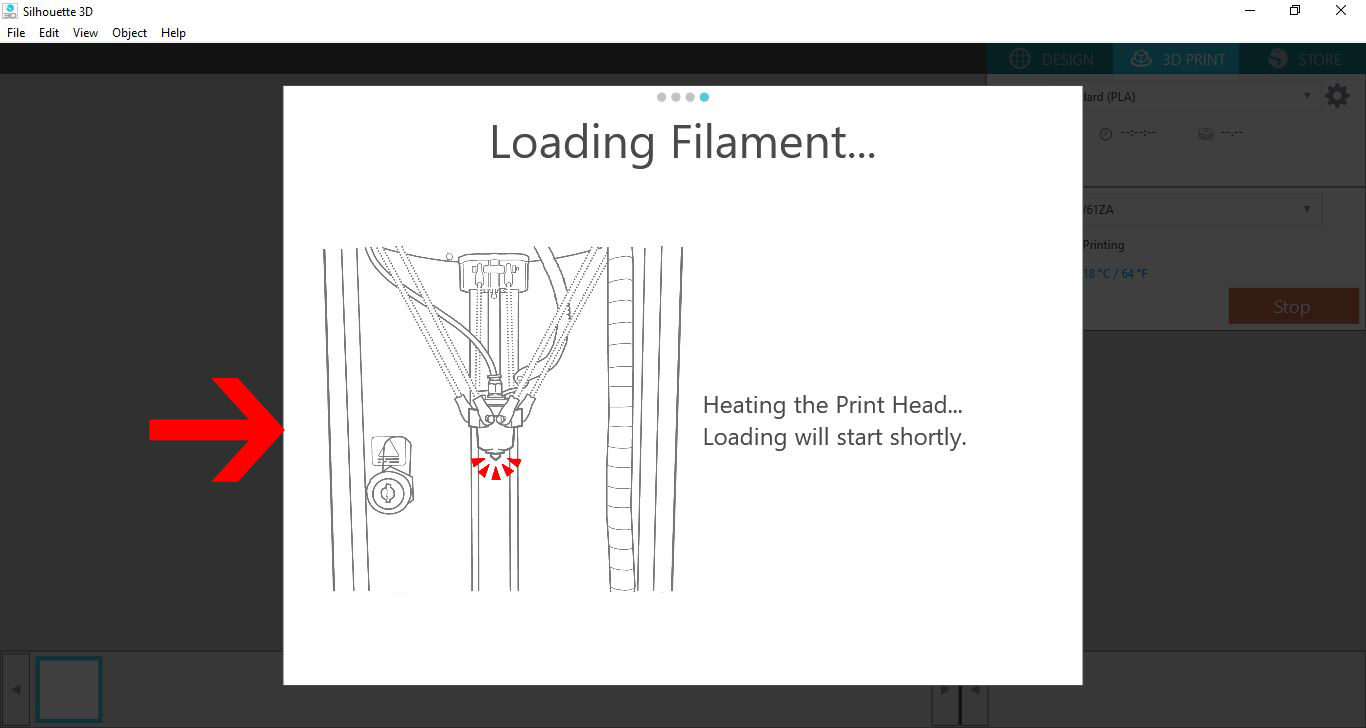 Once the filament is loaded, click on the Load button on your screen.A new window will appeartelling you that the print head is warming up.