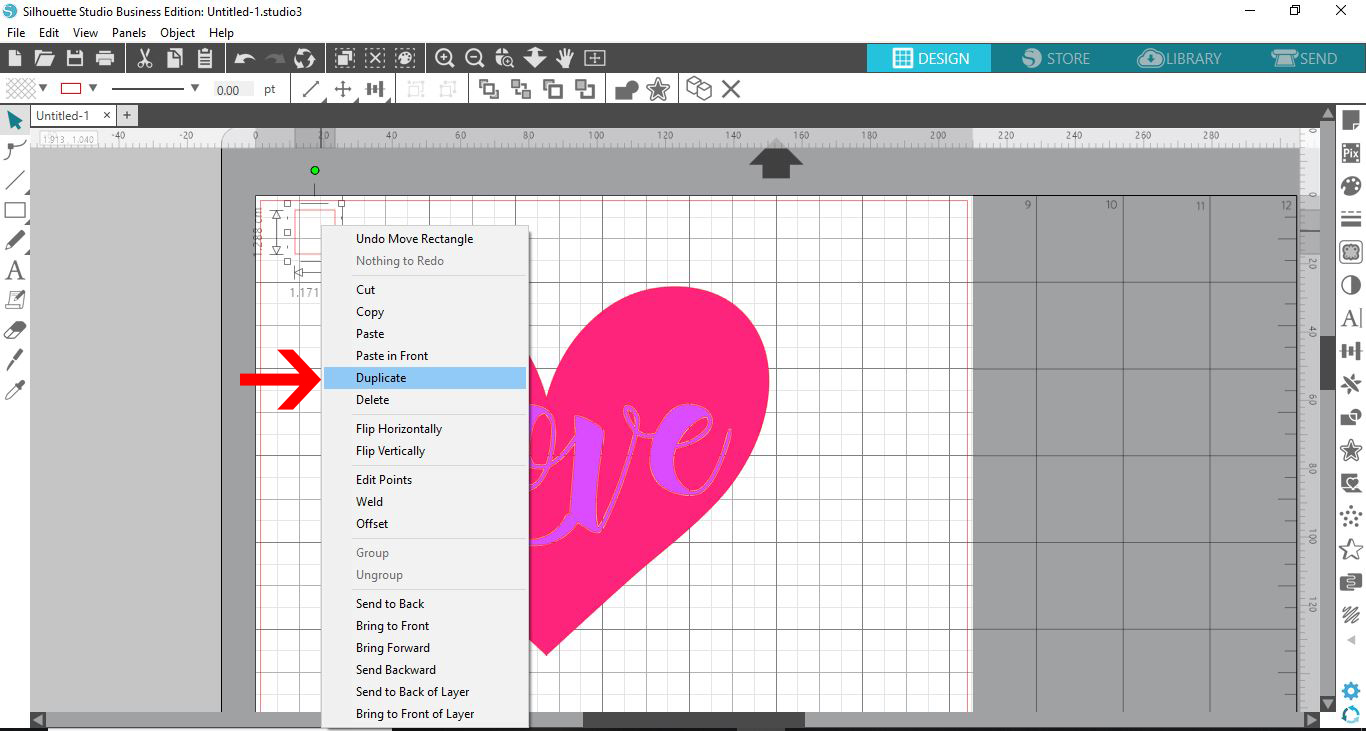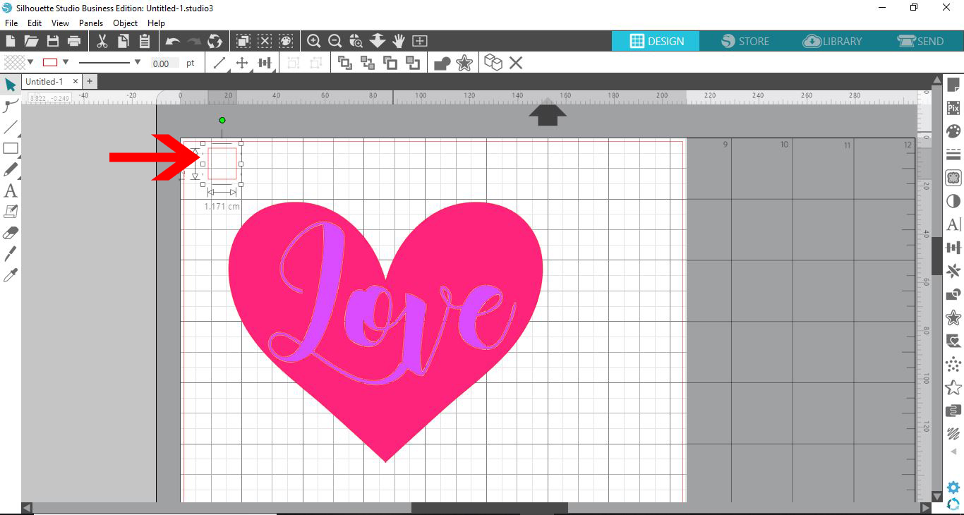 After you have opened Silhouette Studio, create your design. We selected the Heart Flexi Shape and also created a text object with the word ‘Love’. The text was layered on top of the Heart Shape.