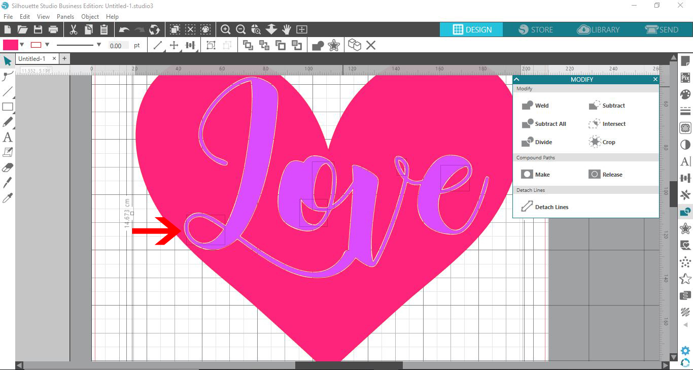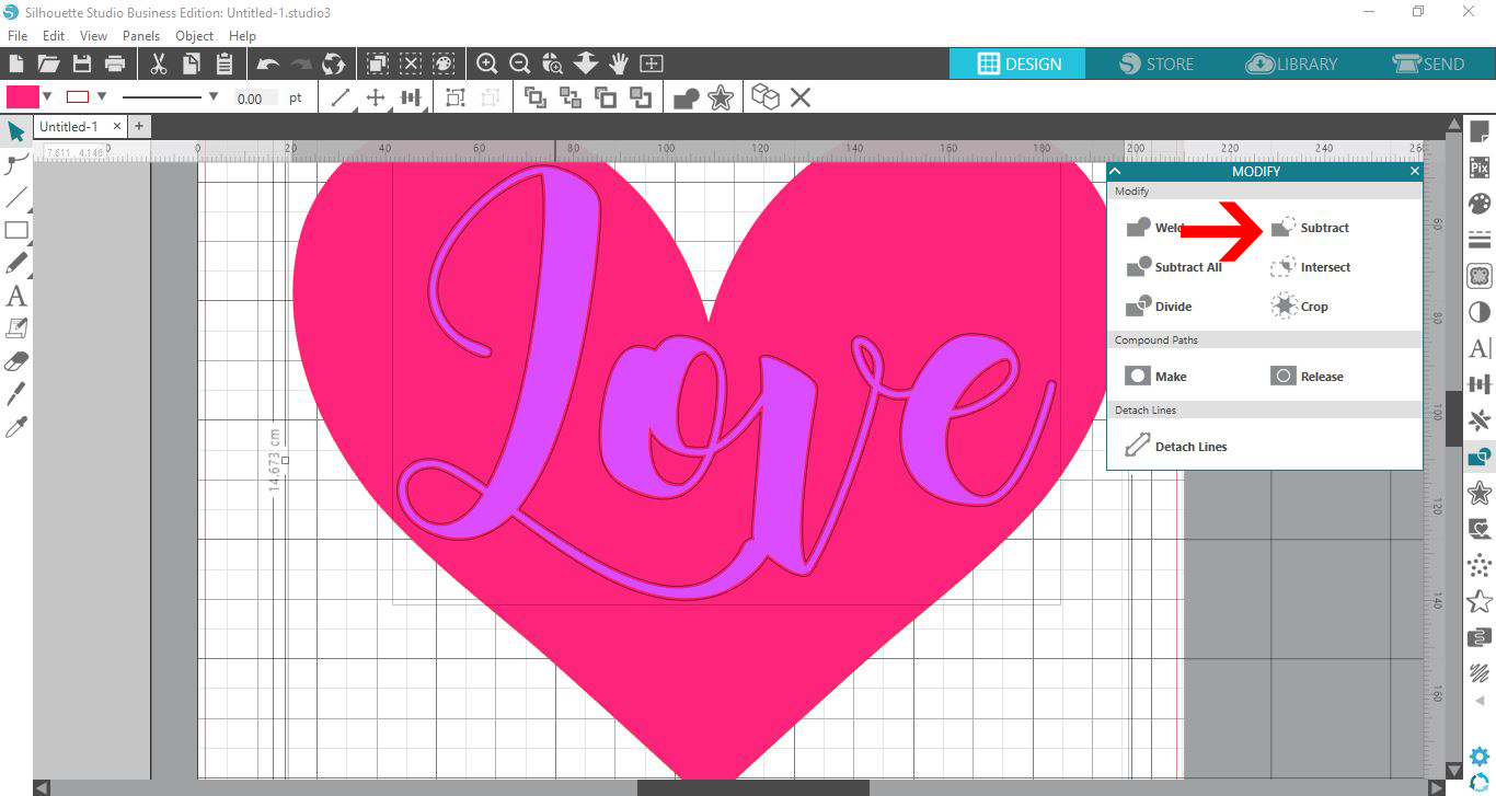 With the offset still selected, also select the bottom part of the design. Then, click on the Modify panel on the right hand side. Under the panel click Subtract. If you would like more details be sure to check out using the Modify panel in Silhouette Studio.