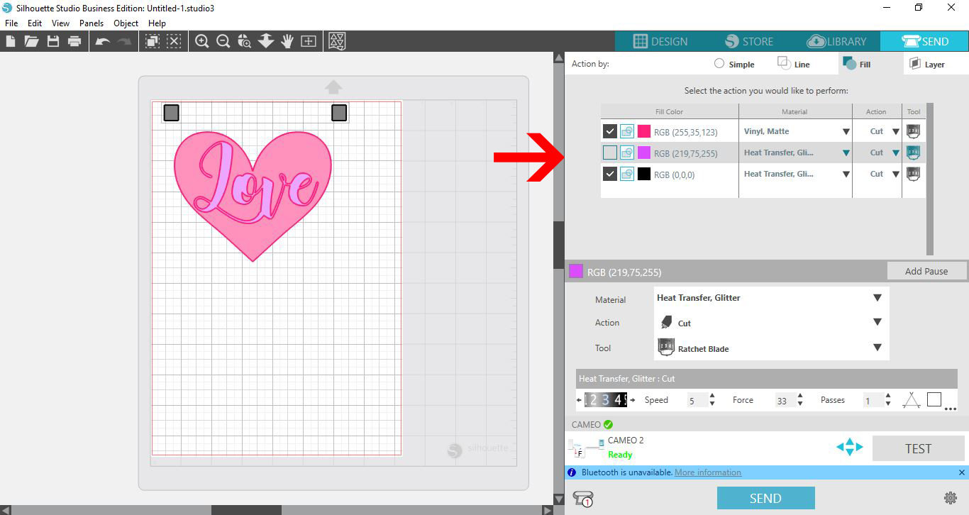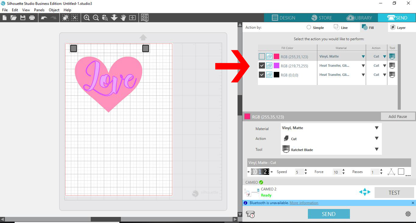 We are now ready to cut out our design. Click on the blue Send button top right corner. In the options, click on Fill. Then tick both the black color and one of the other colors. In this case we clicked on the purple fill, which is for the ‘Love’ text. When ticked, it will tell Silhouette to cut the designs with the selected color fill. Next, click the blue Send button at the bottom to cut with your machine.