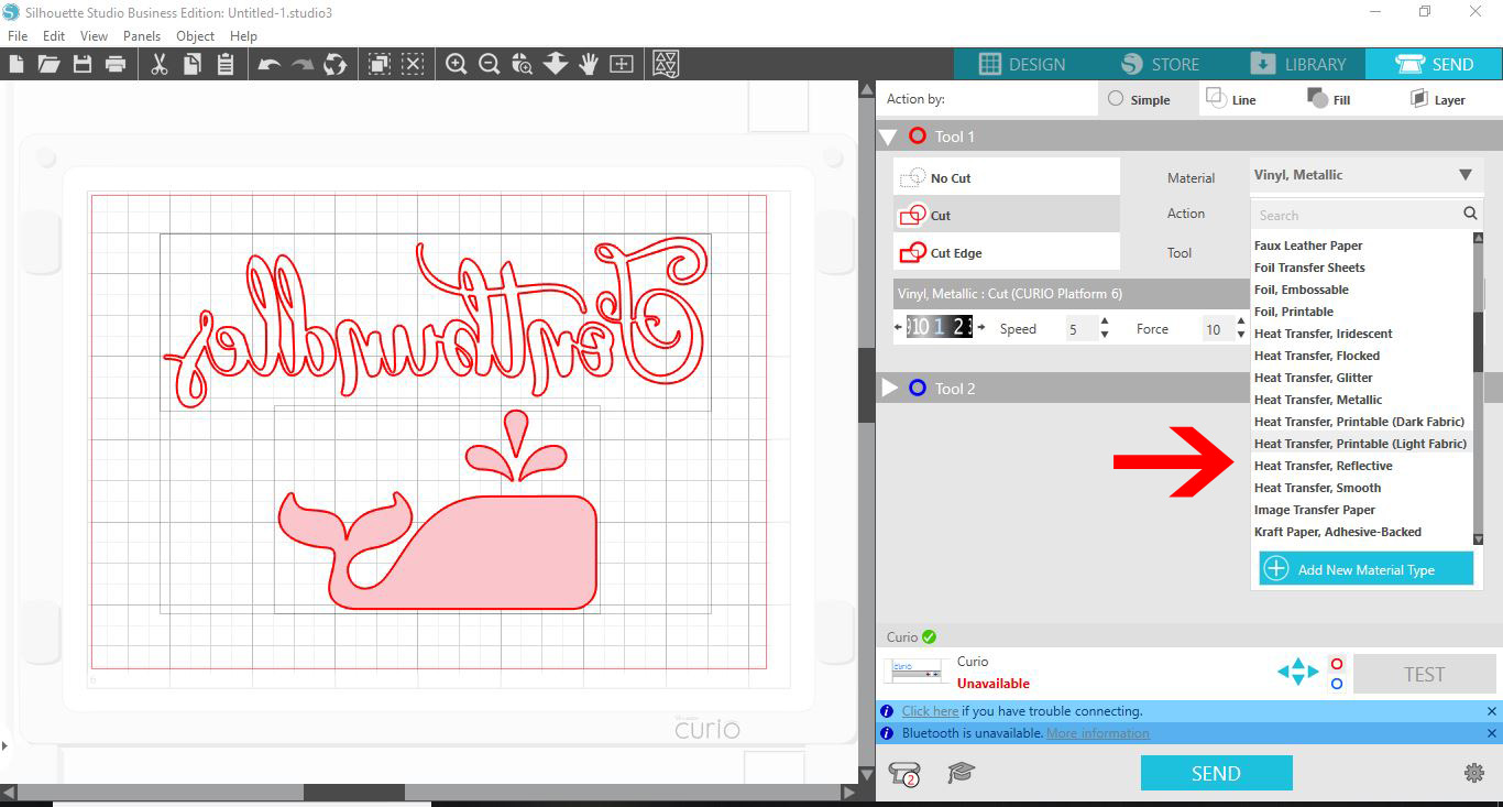 In the image below, we did not mirror the design. Once you have selected the HTV you want to use, click on the Send button.