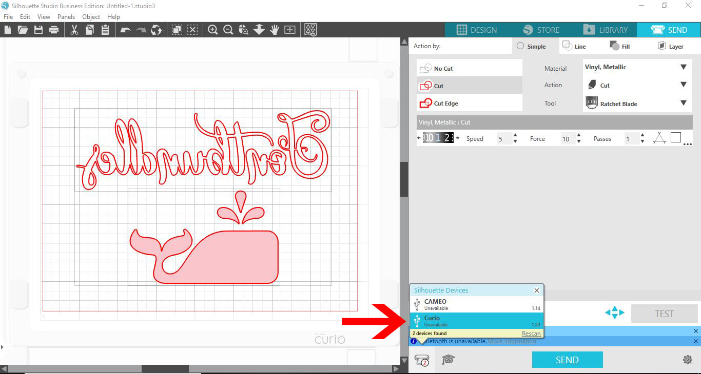 On the top right click on the Send icon to go to the cut settings. At the bottom of the screen, click on the machine icon and select your Curio.