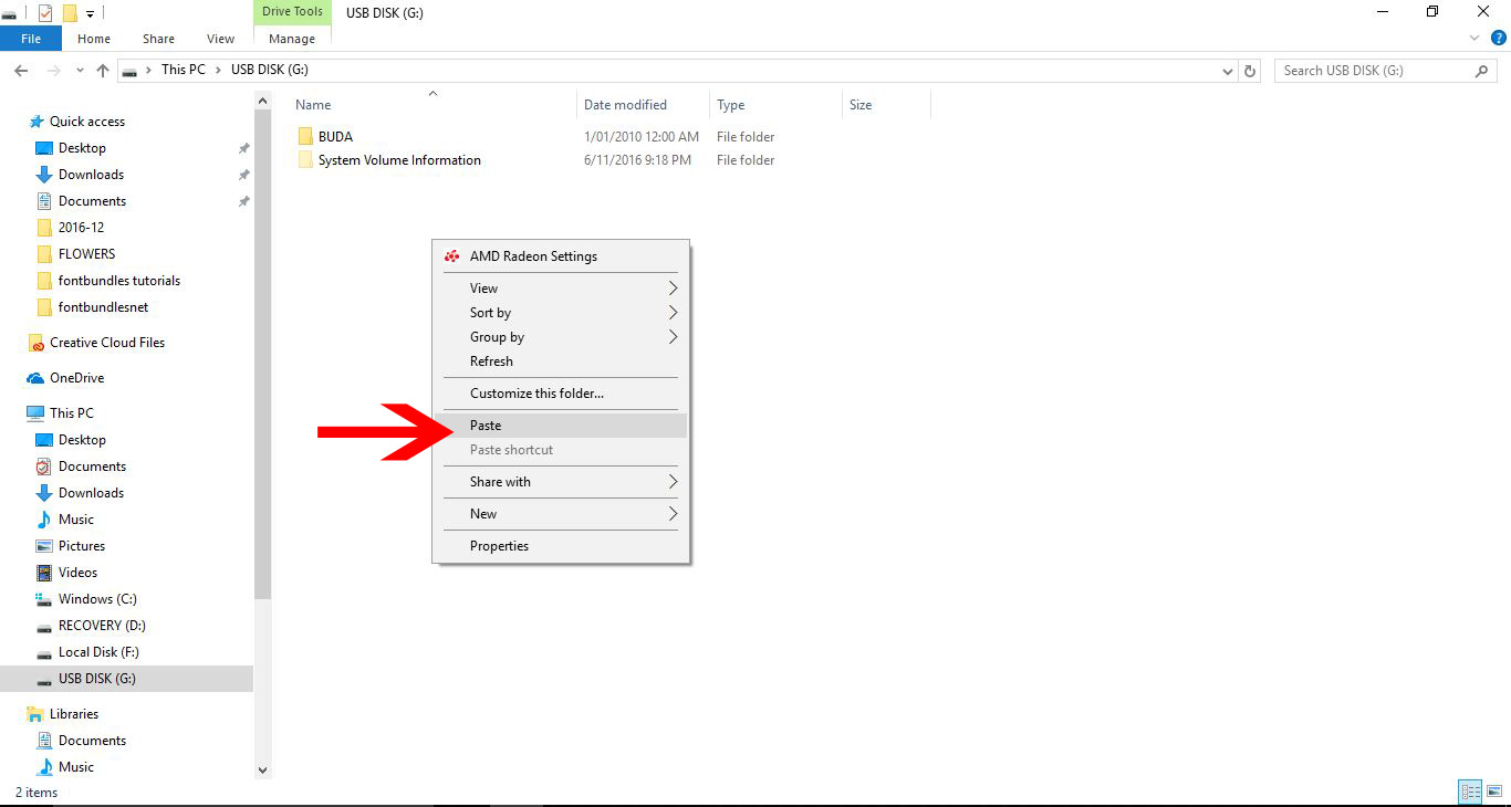 In the window for the external HDD or USB, right click > Paste. You have now copied your fonts over to an external drive.