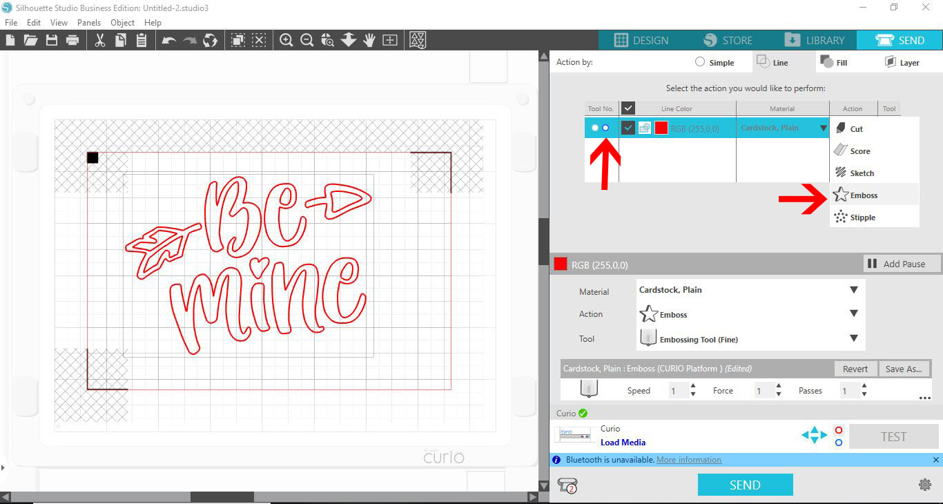 6- You will need to use the cut tool first then the emboss tool. Select the blue circle in the tool option. In the drop down box select the emboss option. Place the embossing tool into the blue circle tool holder and the cutting tool into the red circle holder