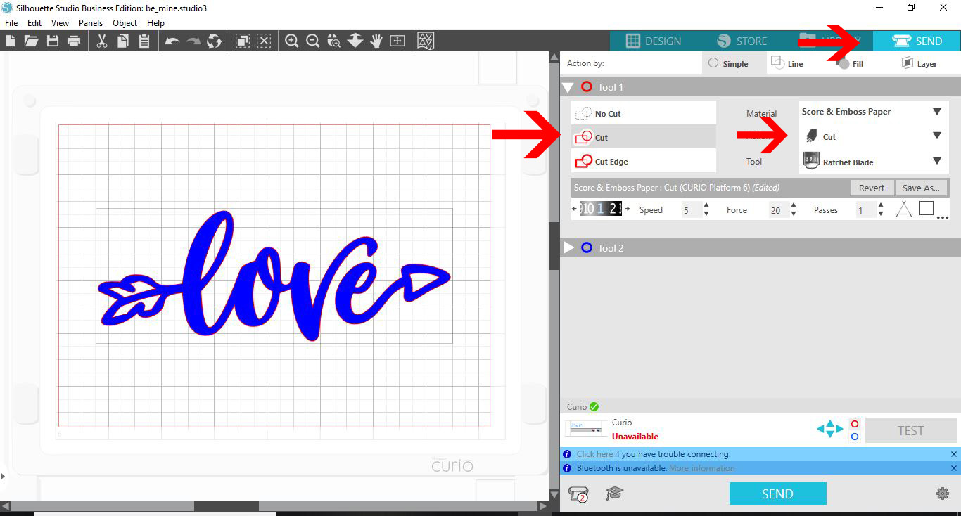 1- Open Silhouette Studio. Click on the cutting mat options and change to Curio. Change the size of the cut area to fit the curio mat.2- With the cutting mat and the size changed, you will see the curio mat appears on the design space.3- Go to page ...
