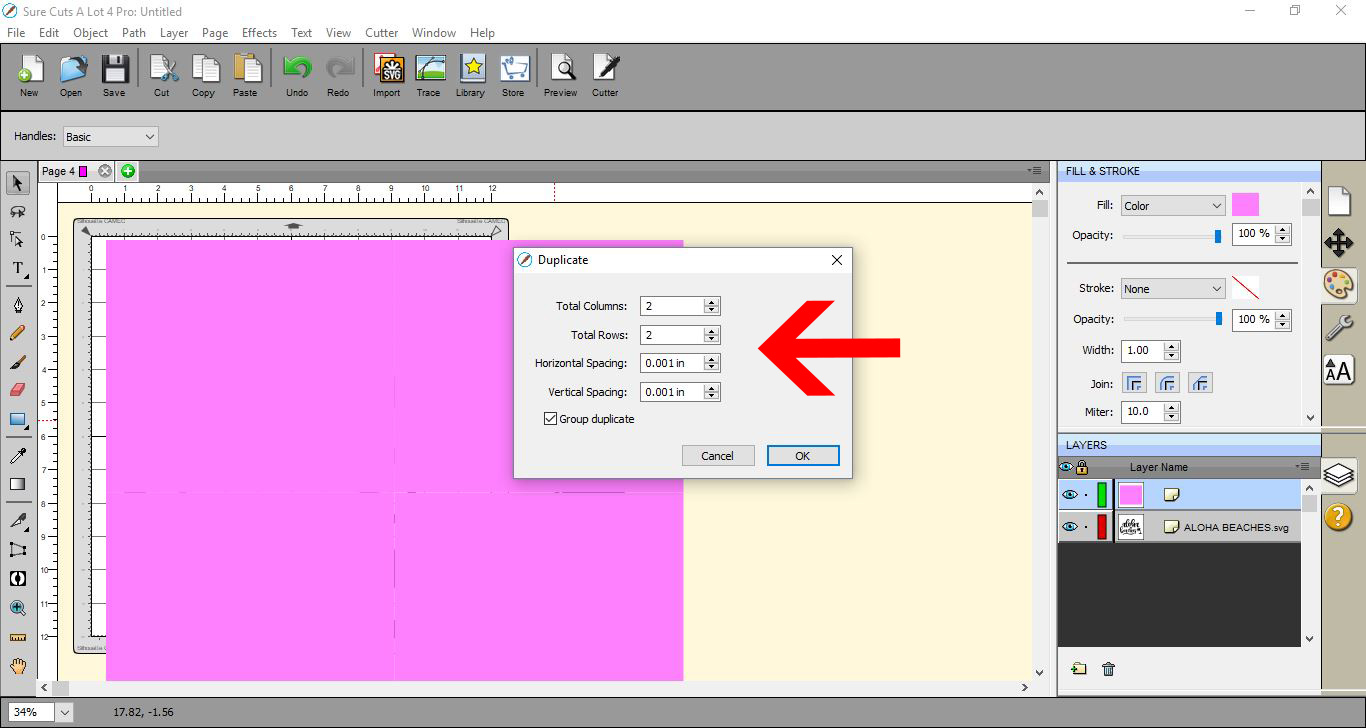 5- A new window will appear. adjust the number of columns and rows you want. I need 2 rows and 2 columns. We also need to close the gap between each rectangle. so with the H and V spacing change to 0.001 inch, so the gap is so small that it appears to be no gap. Check the group duplicate box also so the rectangles are grouped.