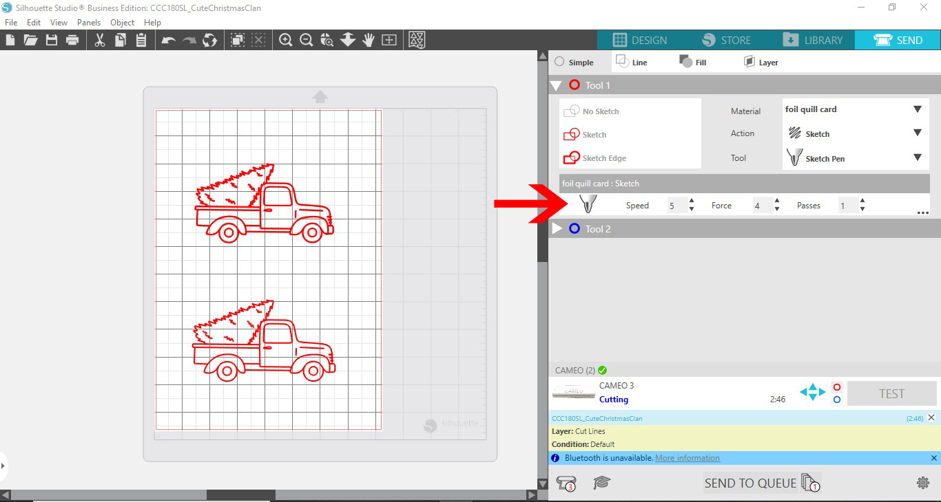 Now that your design is ready,click the Send button top right. Choose your media from the list then adjust the speed and force as needed. For the Action and Tool, make sure the Sketch Pen or Pen is selected.