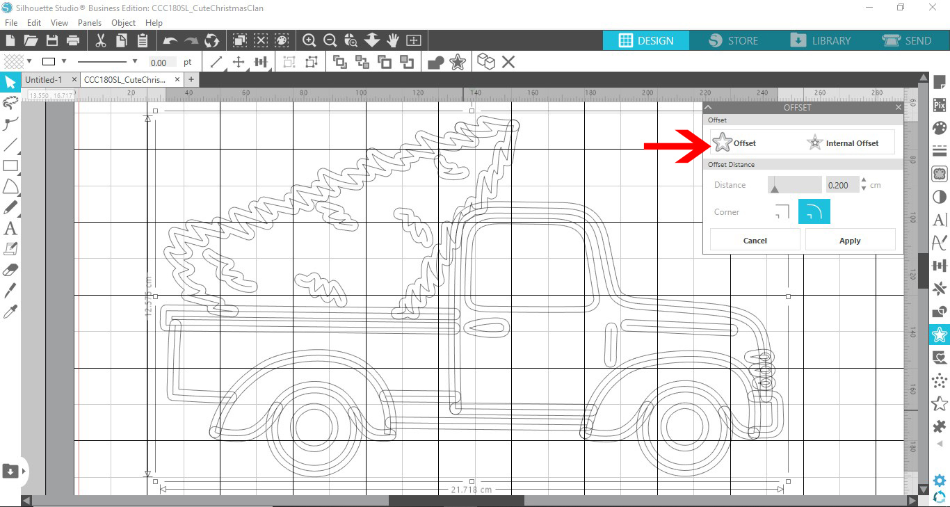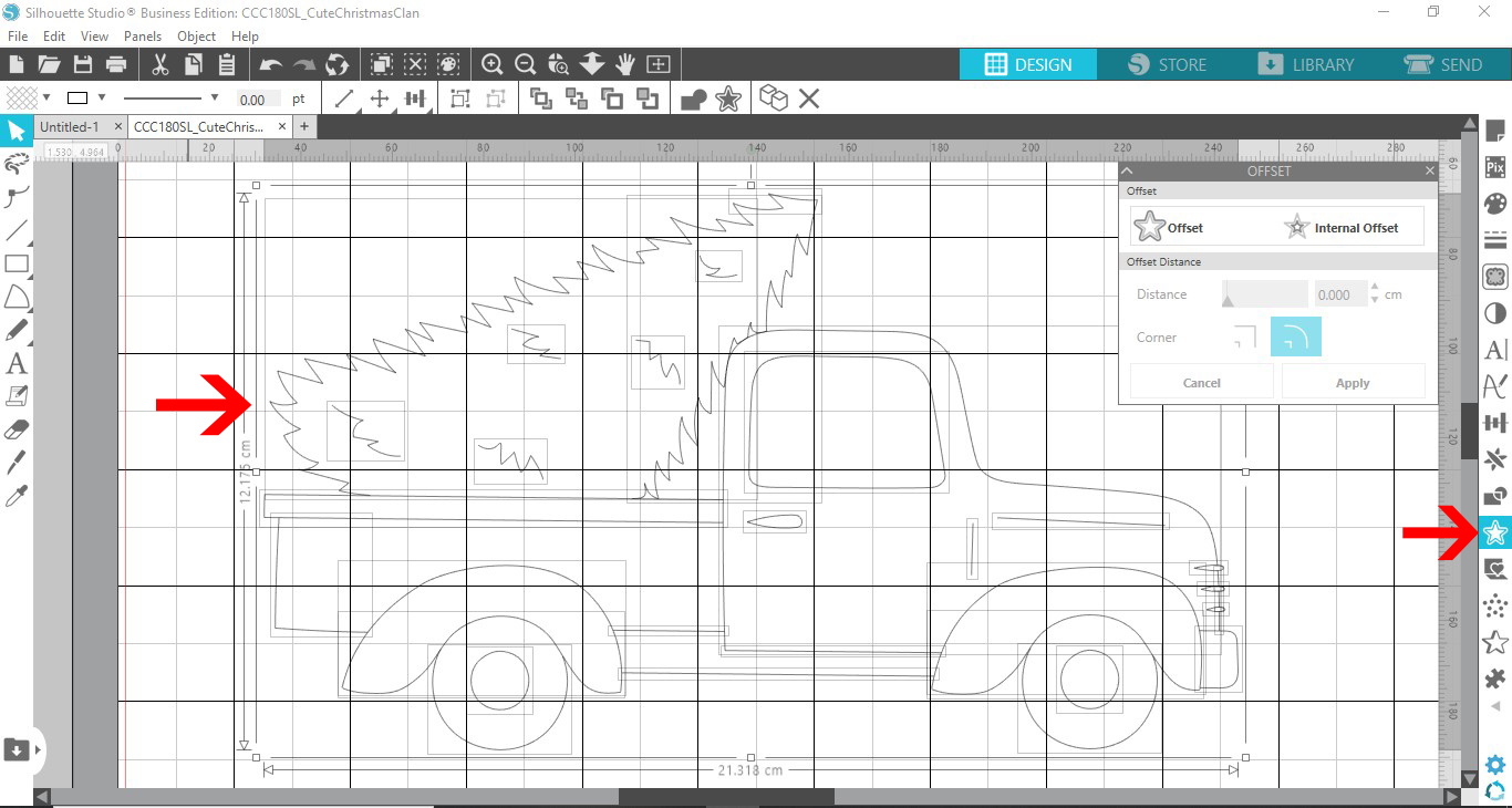 With the new offset still selected, clickon Offset again. A second offset will be applied. Once again adjust this second offset so it almost touches the original design lines.