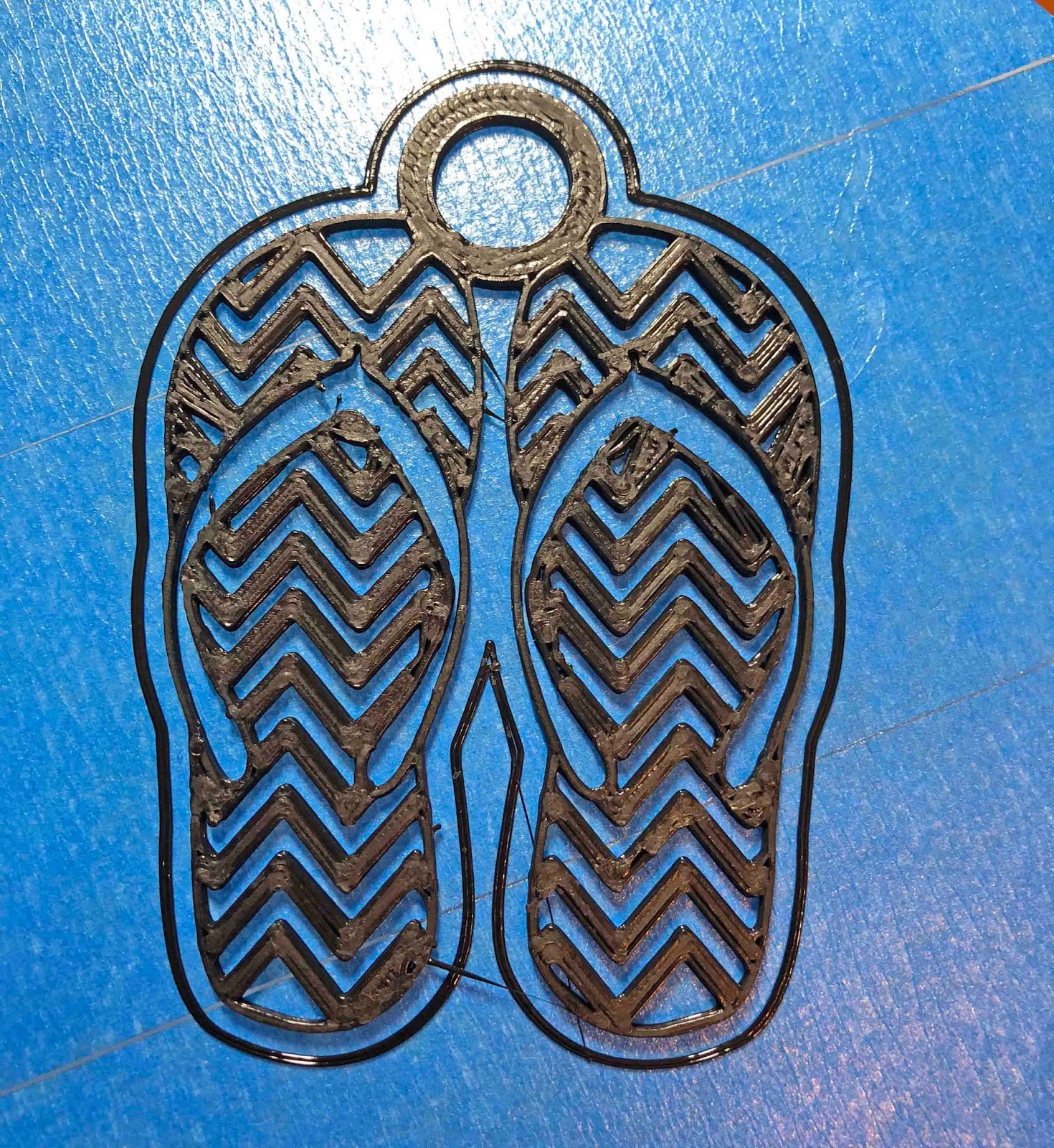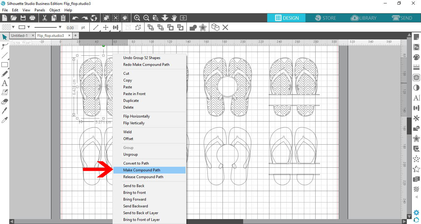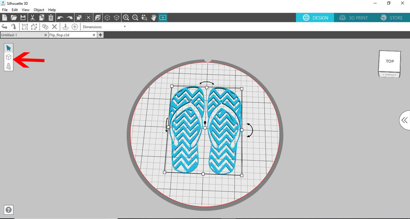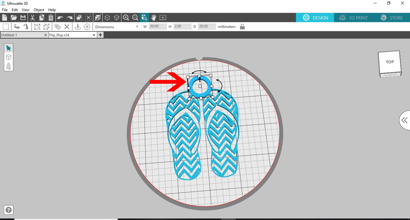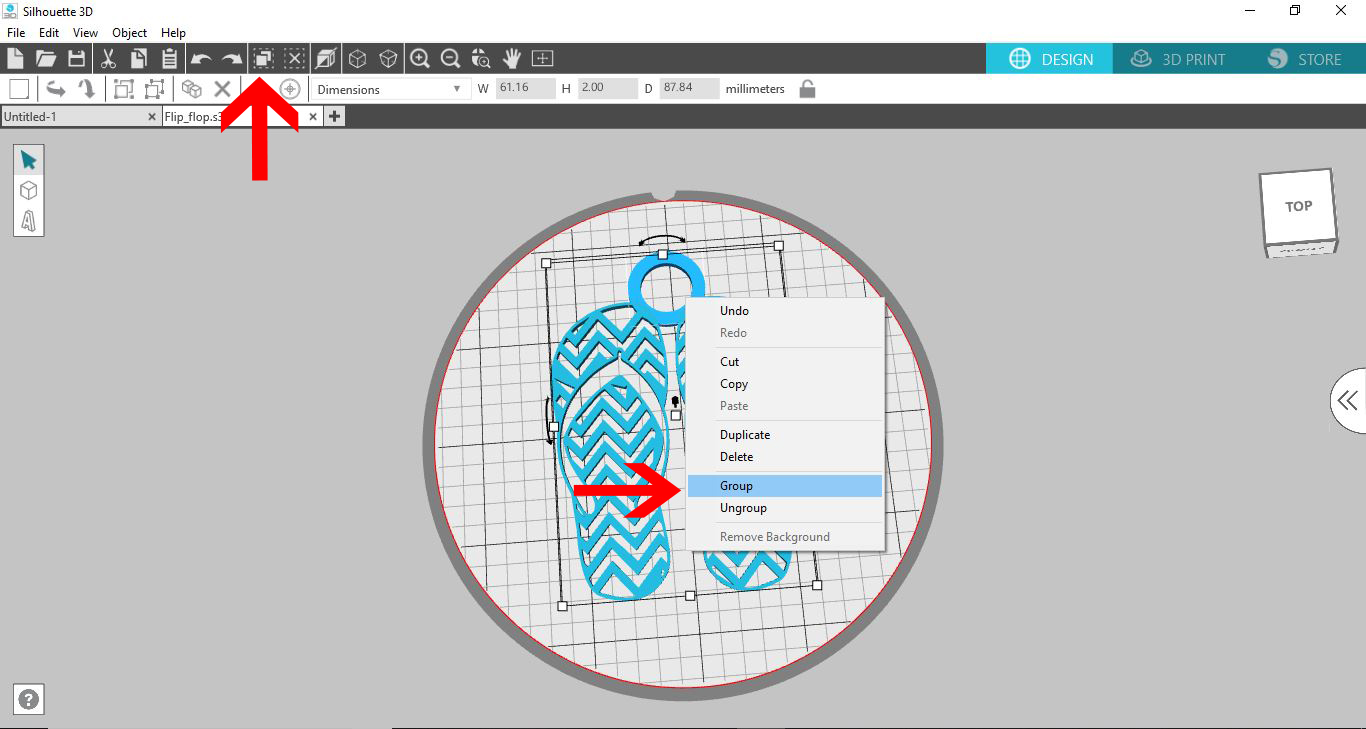 13- If you want ot add to your imported design you can add and group it. I have added a tube to join the 2 flip flops and at the same time create a loop to create this design to a keyring.