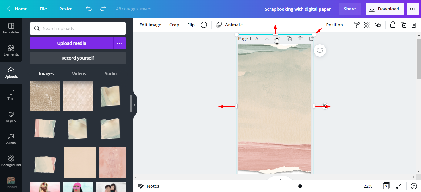 This time, we’re going to make a travel scrapbook page using this ripped notepaper. We already created the layout and added some travel photos from the Canva library. We have an excellent tutorial on using templates to create a layout if needed.