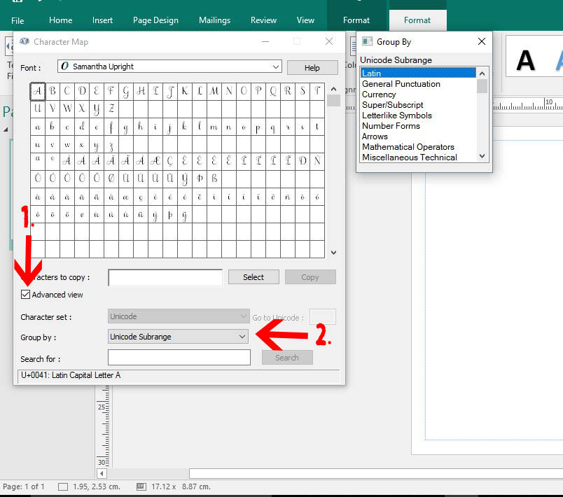 Make sure that the Advance view is selected (1). Then go to Group by and select Unicode Subrange (2).