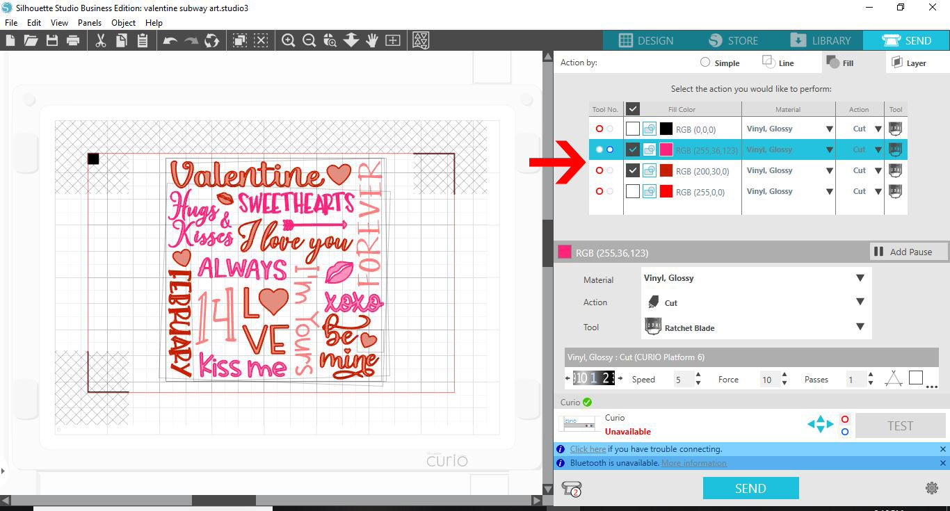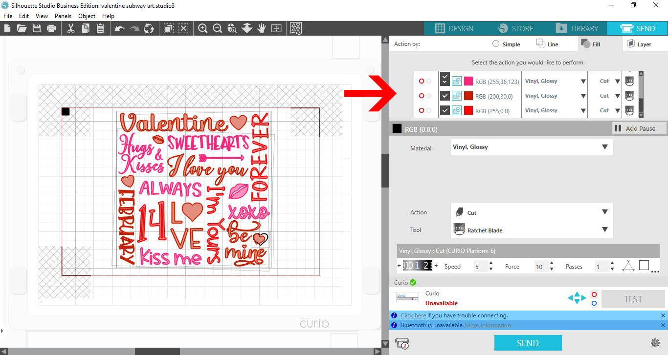 1- Open Silhouette Studio. Click on the cutting mat options and change to Curio. Change the size of the cut area to fit the curio mat.2- With the cutting mat and the size changed, you will see the curio mat appears on the design space.3- Type your text.4...