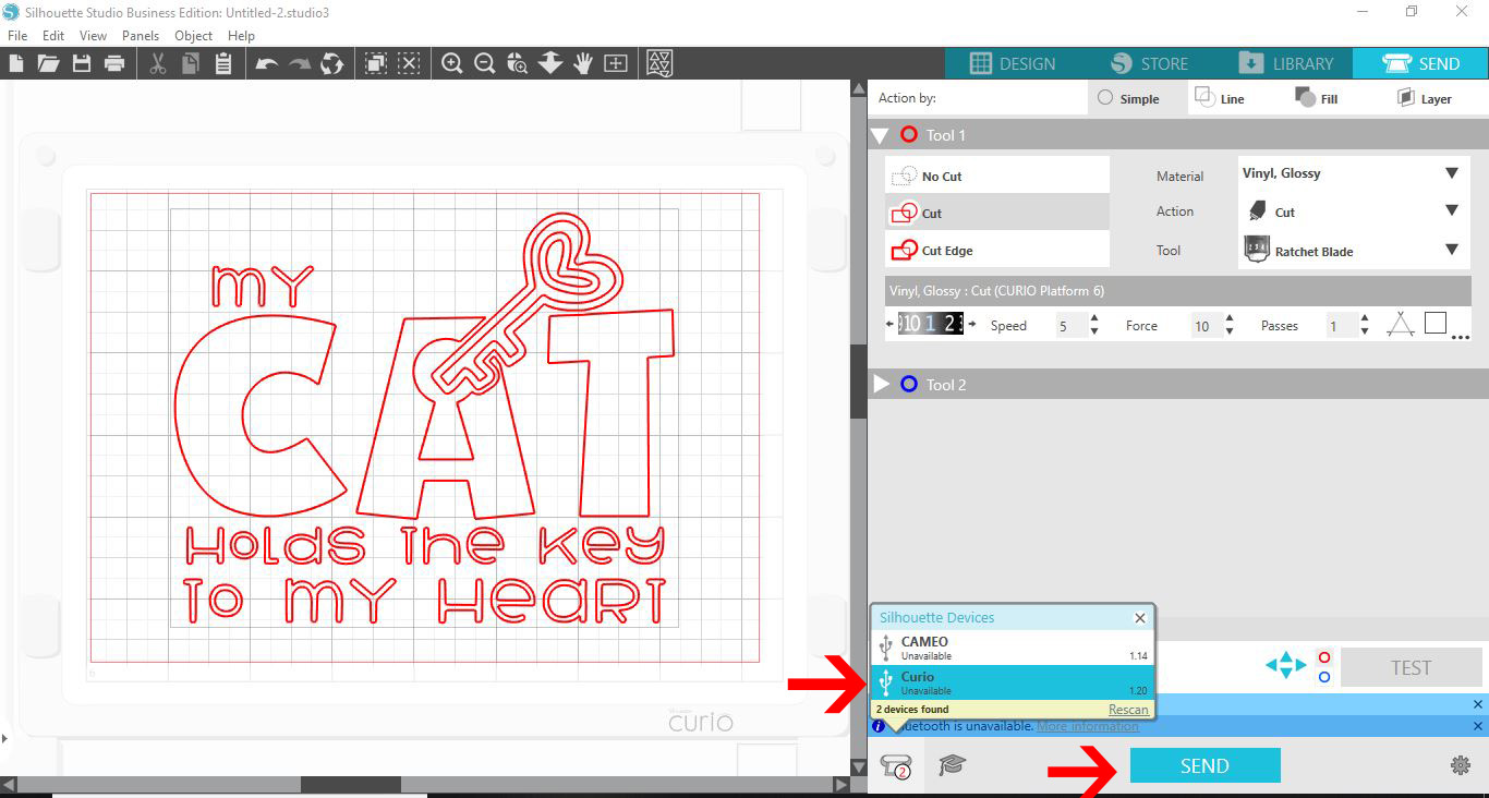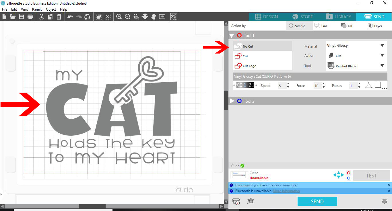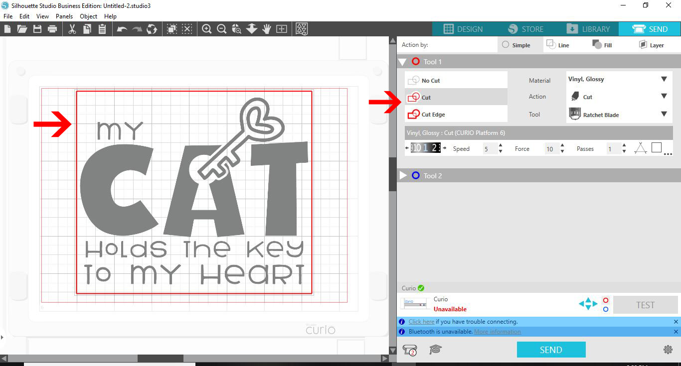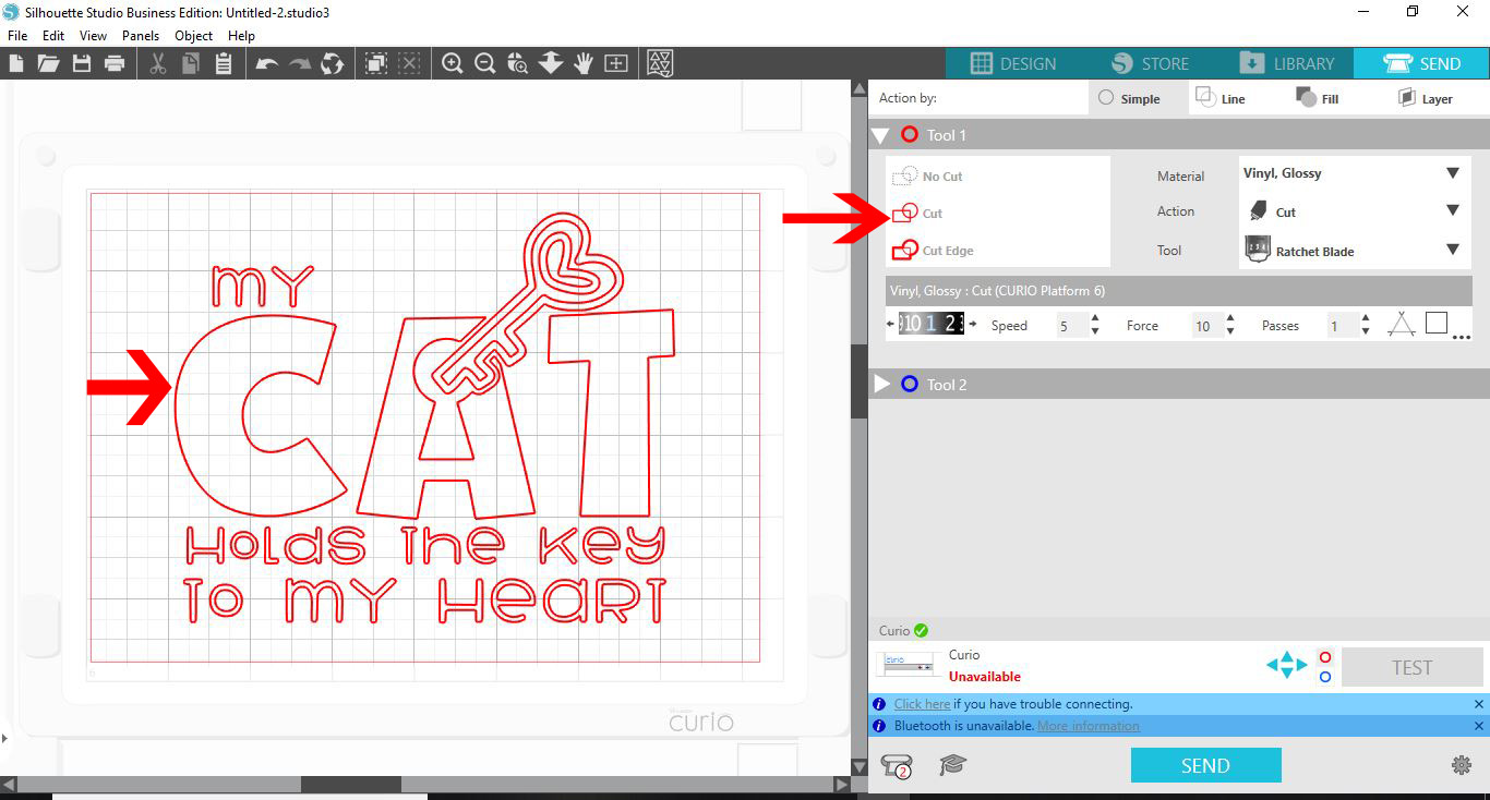 11-Click the send option. You will now see red cut lines for your design. If for any reason you do not see them click on the cut icon.