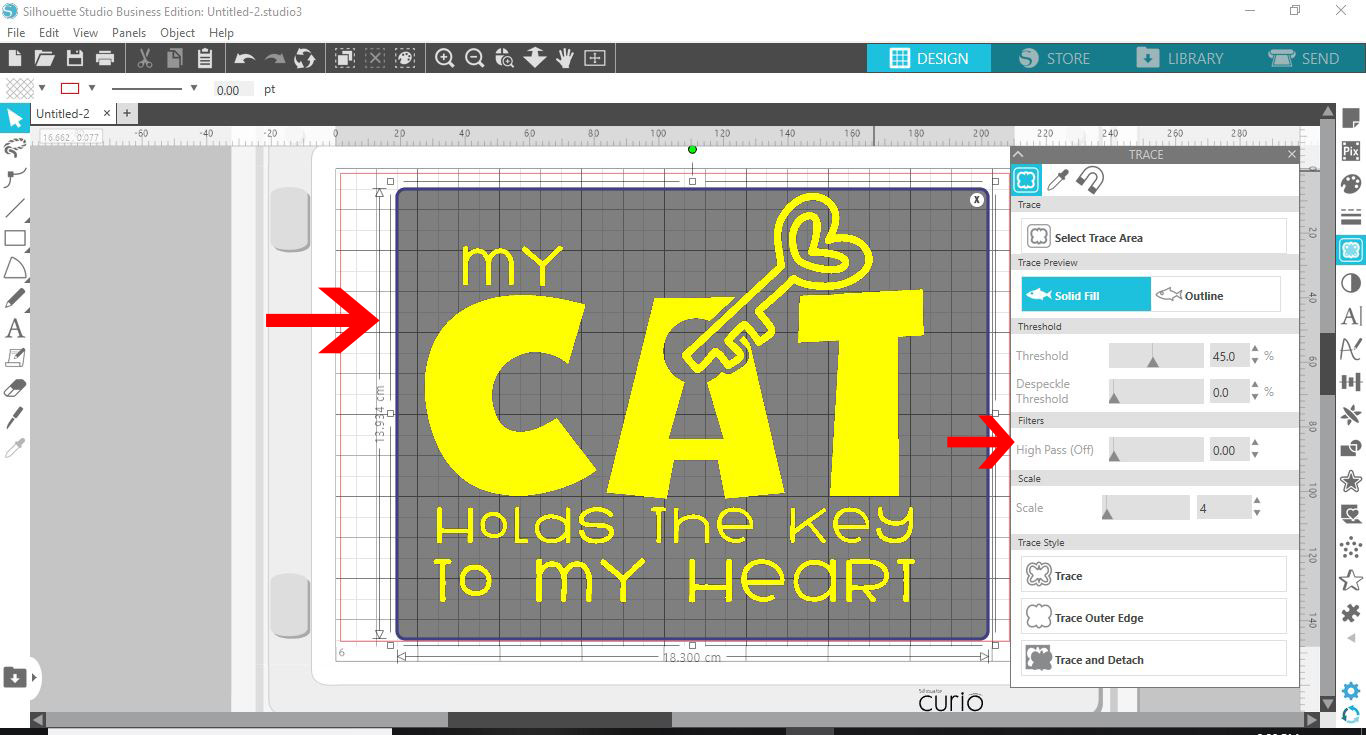 9- Your design will highlight yellow. Make sure all parts are highlighted. Adjust the threshold and the high pass to make sure everything is selected. Click on trace.