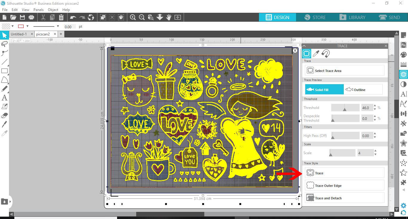 You may need to adjust the Threshold as we did so everything is highlighted in yellow. Now, click on the Trace option at the bottom of the panel. If you have never used the Trace Panel before, we have a great tutorial on how to trace in Silhouette Studio.