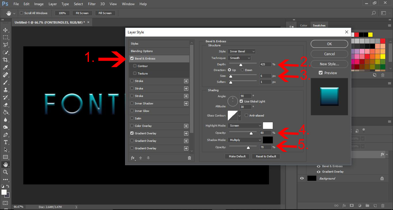 15- A new window will appear. Select bevel emboss (1). We now need to change a few settings. We need to change the depth to at least 425% (2). Next increase the size to 6 px (3), then change the highlight mode opacity to 80% (4) and finally chnge the shadow mode to approx 70% (5).