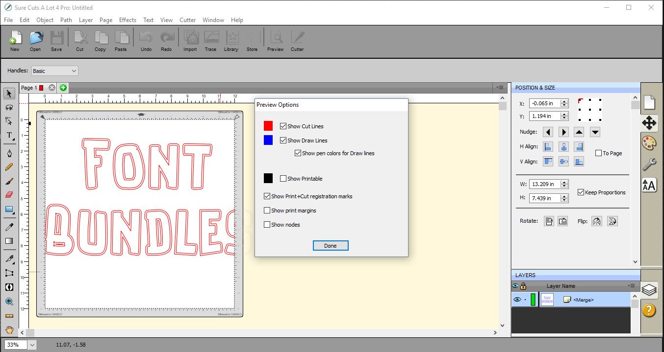 16- The merge will remove the middle of your text leaving an outline. You can click on preview to see how it will cut.