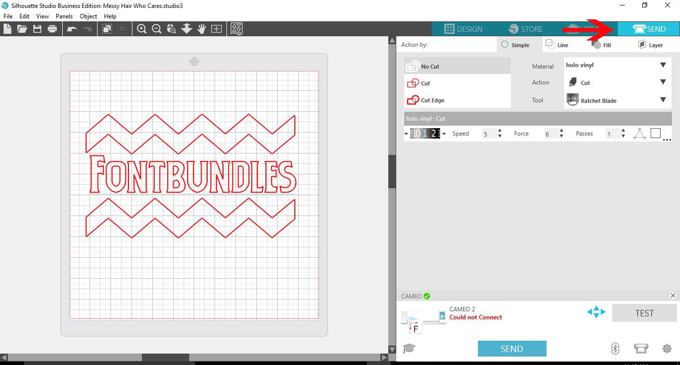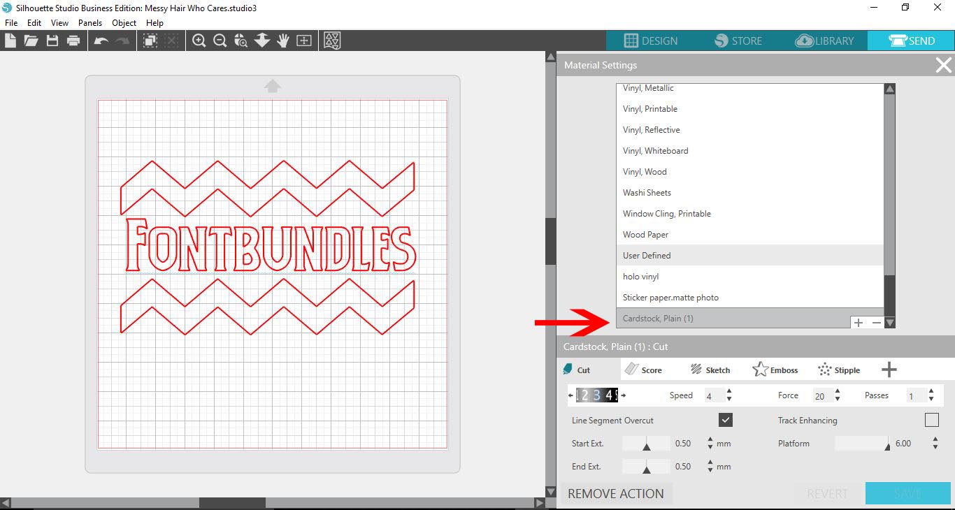 The Send panel is where you will find your cut and material settings. Here you will be able to adjust according to your needs. Next to the Material option select your media. Make sure Action is set to cut and then choose your Tool.
