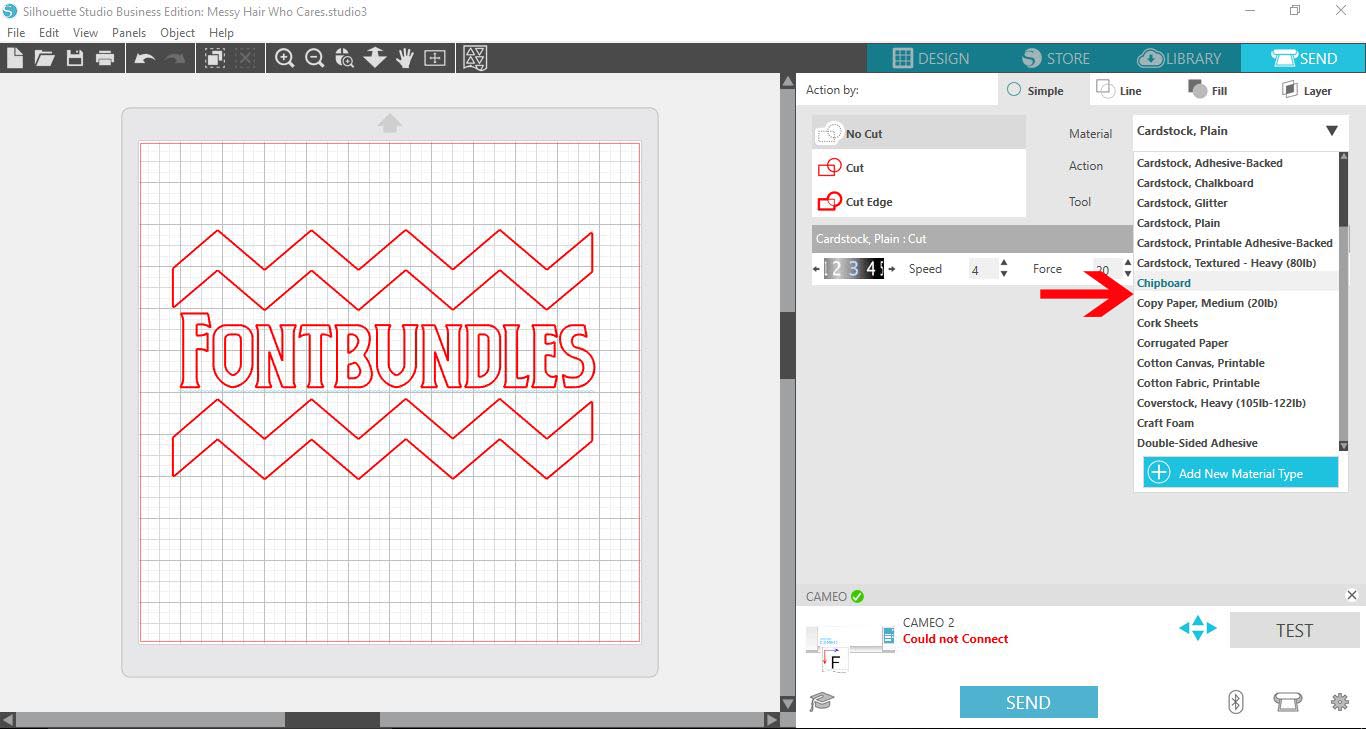 Next, click on the Send icon to access the material cut settings.